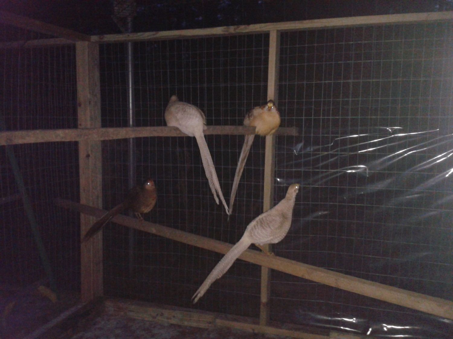 the six male pheasants that are not going to be in the breeding program...sorry boys...funny thing is the yellow one in the pic thinks the one in the middle bottom is a female cause it doesn't have its full colors yet...hahahahaha....funny guy