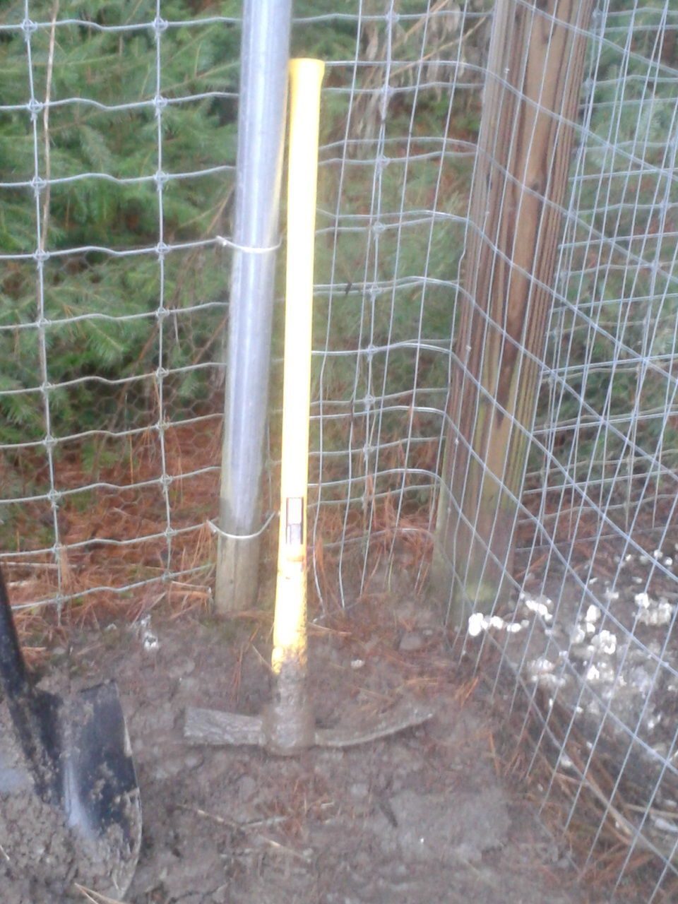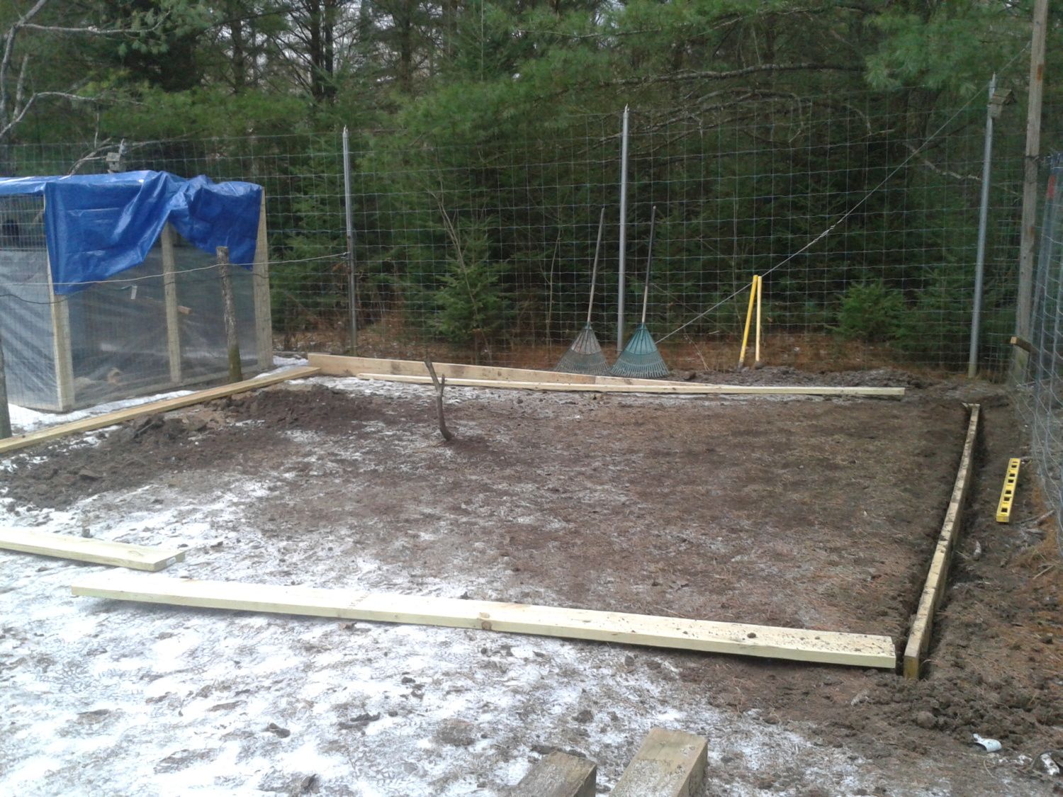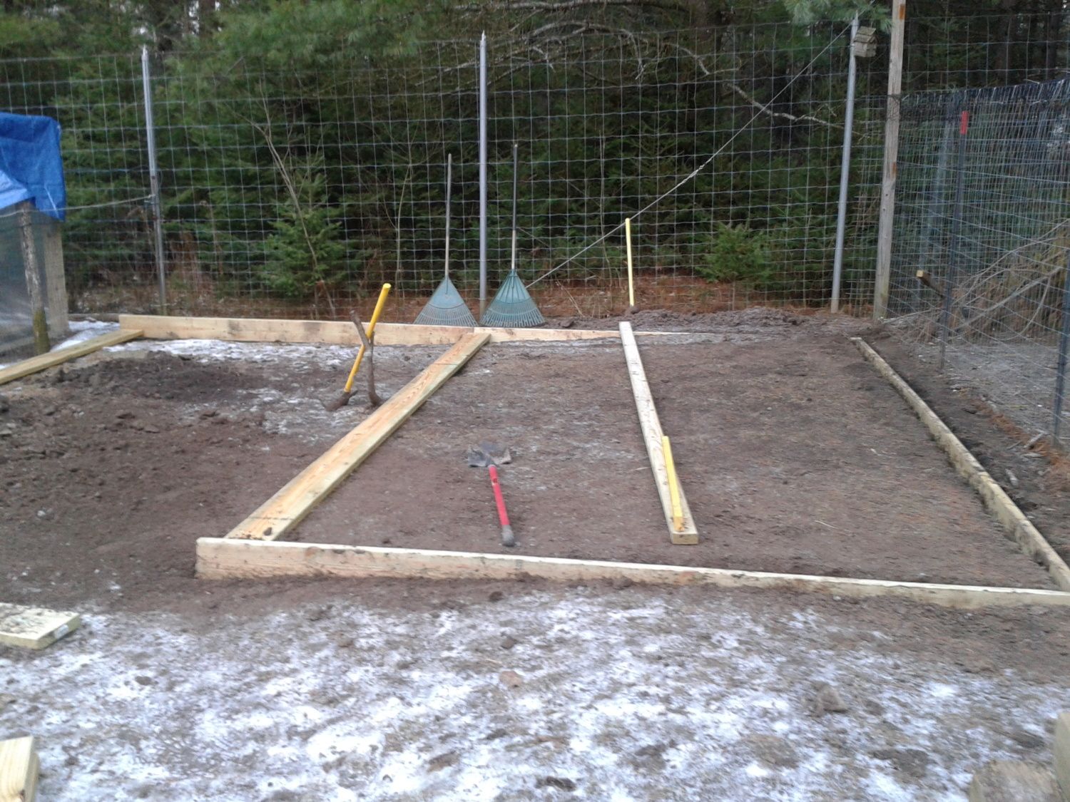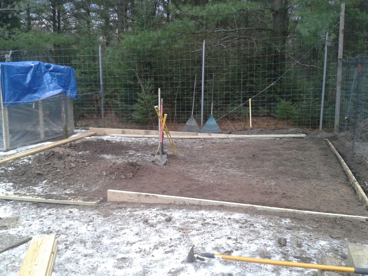 today was not really productive...it was like 45 out so the ground wasn't that hard...I got one side in the ground...still four left...so yeah thanks for the tool idea....as you can see I picked one up and it works wonders....the ground is off level by roughly eight inches so made it level..wow this will be a fun time...lol...not really but it will get done tommarow...cause the day after that I have to pick up wood for the walls....so here is some pics from today