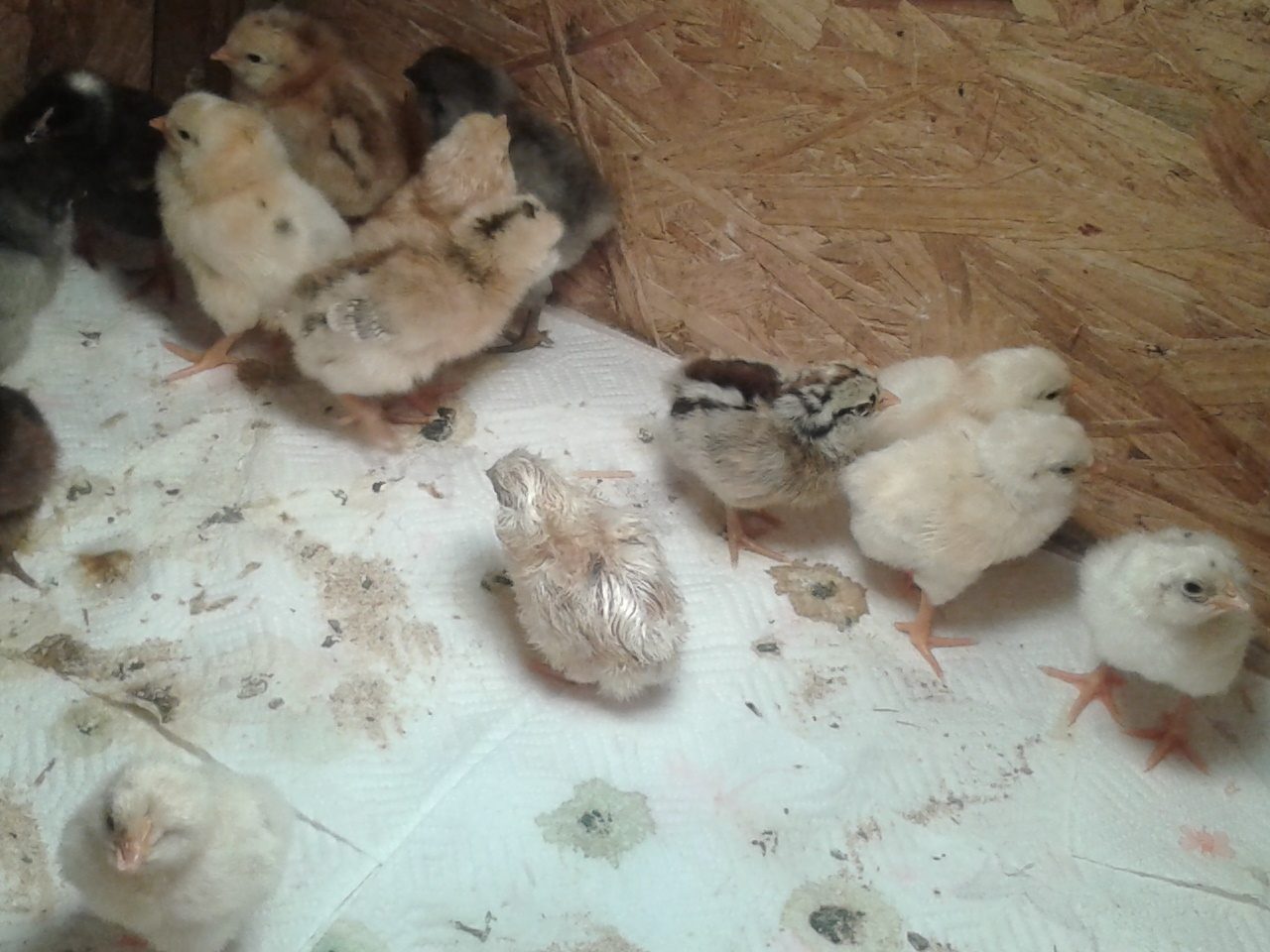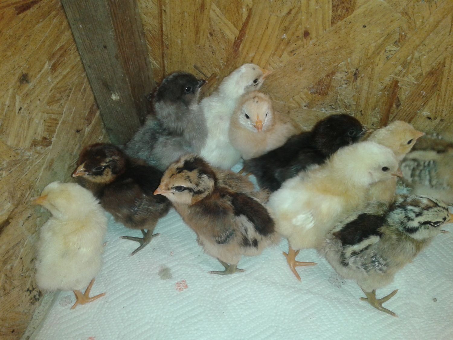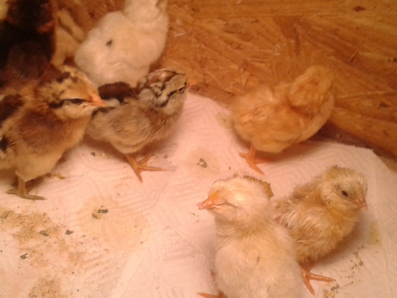 Your chicks are doing great....the frizzle cochin i got your chicks to keep company died. i think he got to cold cause he was the only one in the brooder and he couldnt get close enough to the light. i modified the brooder and put the light about 4 inches off the floor in one corner so they can get close to it if they want....i made a stand out of 1/4 hardware cloth so the light cant fall in as it sits on the stand and is clipped on the side of the brooder to be double secured. We got home the night we picked up the chicks from you and he was dead...i think the cochin size, single chick, and light distance was just a mix he/she couldnt over come. The 3 i got from you are very happy and are all chirpy in the day time...eatting good and drinking plenty of water. i also noticed 2 of the 3 chicks have muffs comming in.