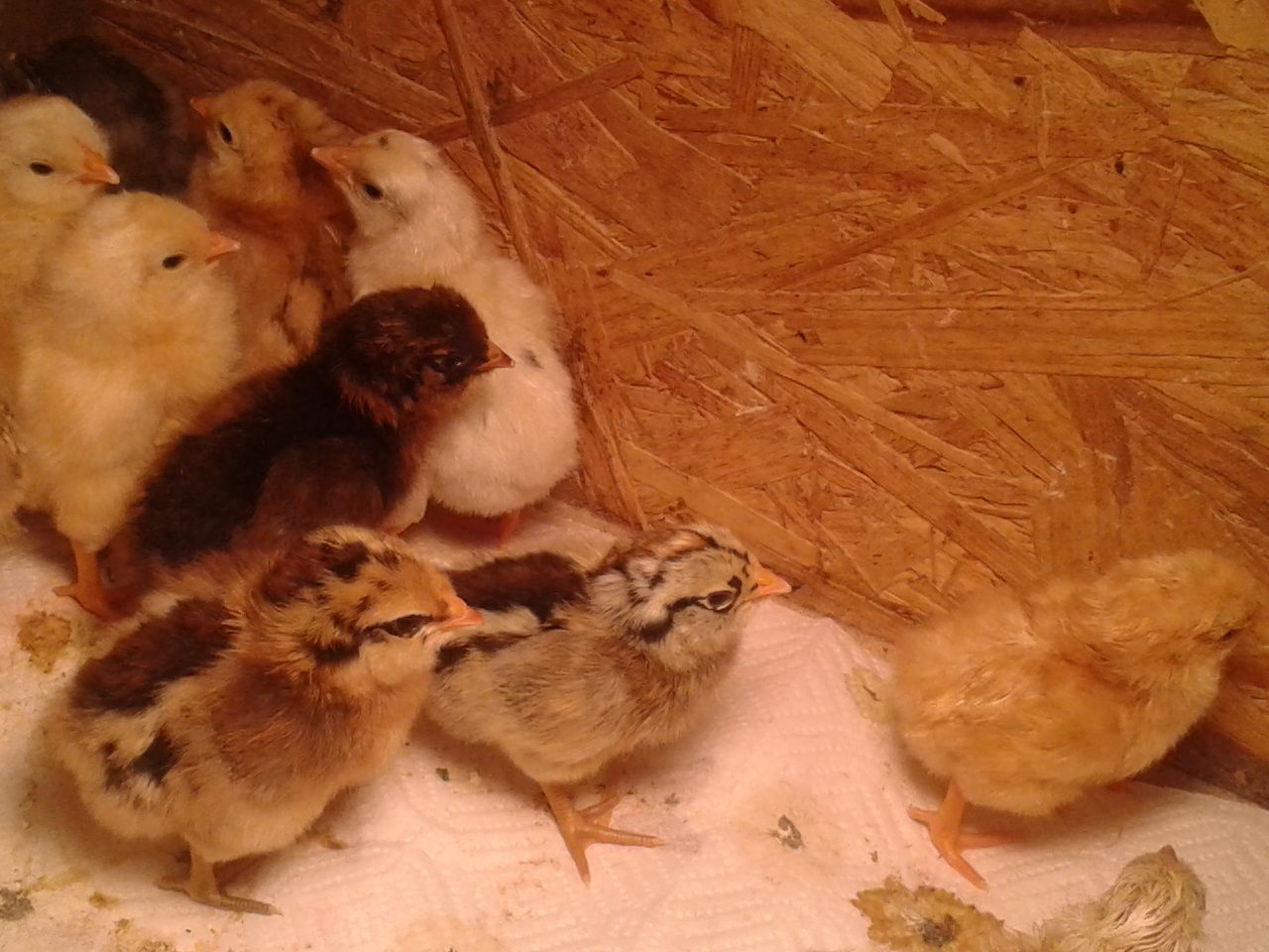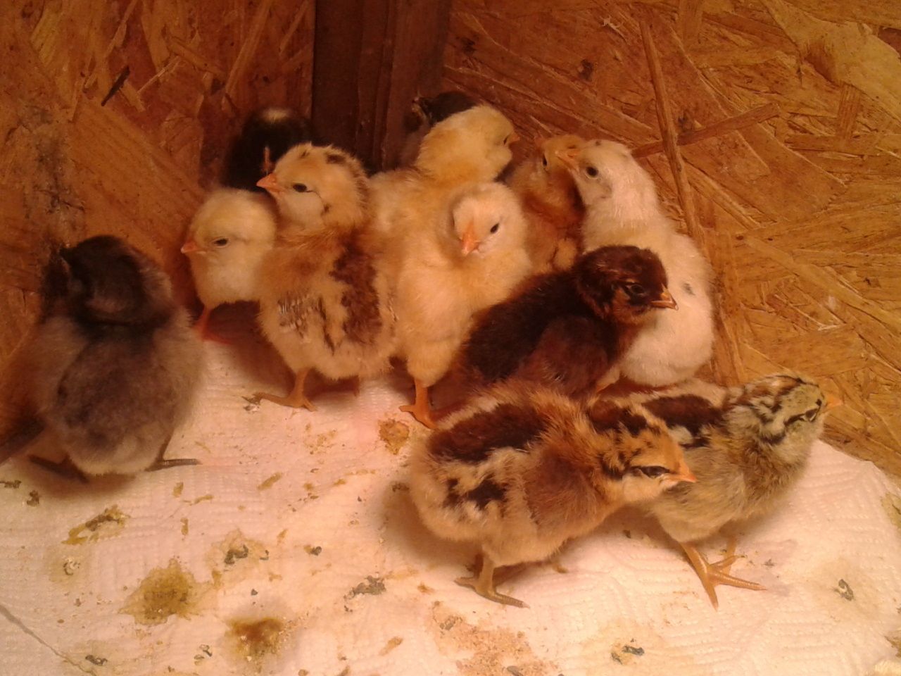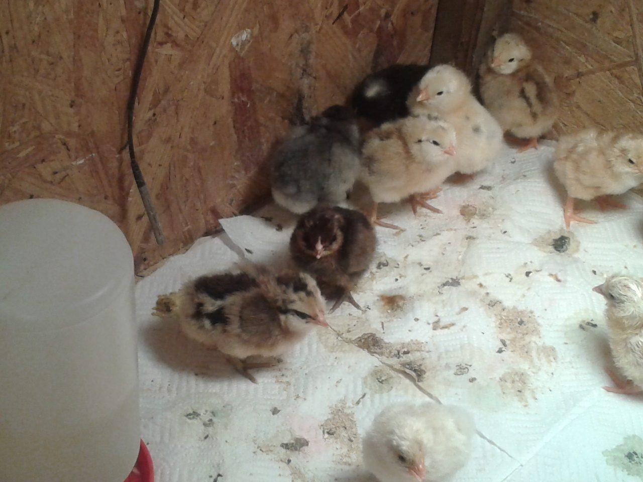 Your chicks are doing great....the frizzle cochin i got your chicks to keep company died. i think he got to cold cause he was the only one in the brooder and he couldnt get close enough to the light. i modified the brooder and put the light about 4 inches off the floor in one corner so they can get close to it if they want....i made a stand out of 1/4 hardware cloth so the light cant fall in as it sits on the stand and is clipped on the side of the brooder to be double secured. We got home the night we picked up the chicks from you and he was dead...i think the cochin size, single chick, and light distance was just a mix he/she couldnt over come. The 3 i got from you are very happy and are all chirpy in the day time...eatting good and drinking plenty of water. i also noticed 2 of the 3 chicks have muffs comming in.