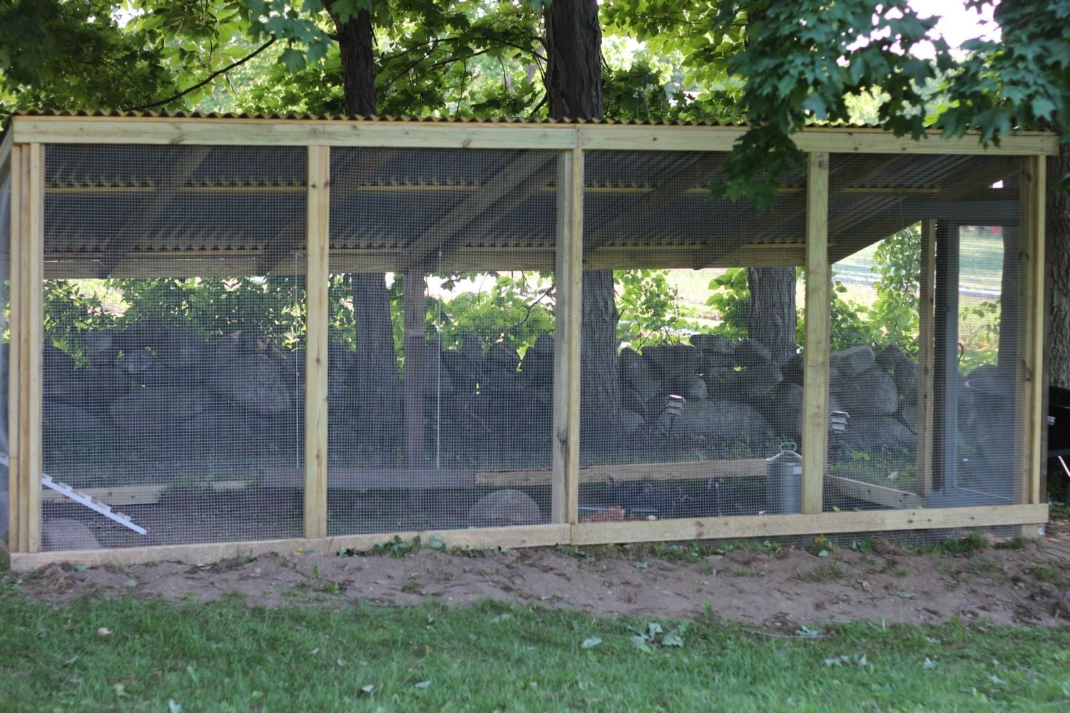 It's a lot like Wynette's except that we buried our 1" chicken wire almost 18" into the ground. We also used cement with our 4x4 posts and spaced them 8 and 1/2 feet apart. Our run is six feet high so we can walk into it, I don't have it covered at this point as I have goats in with my chickens and the hawks have thus stayed away. (Not to mention the dogs and cats "guarding" the place. /img/smilies/big_smile.png