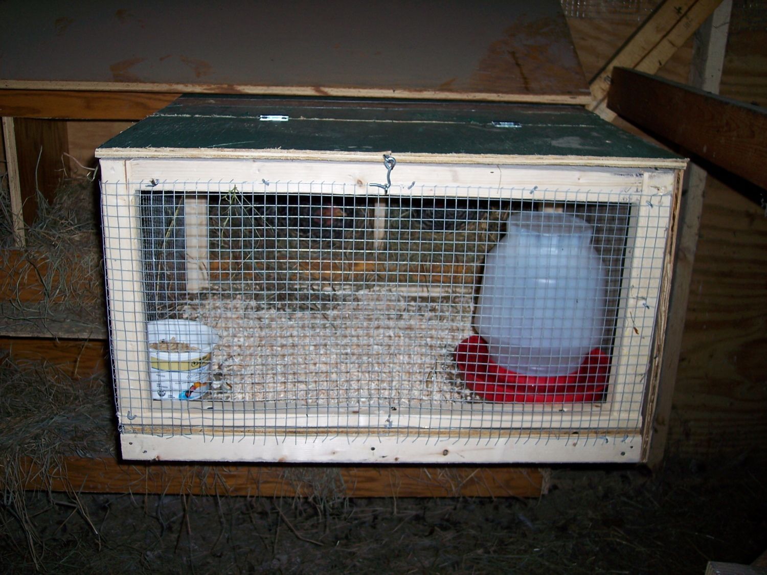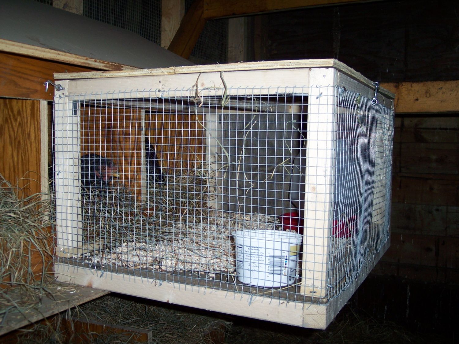 My problem began when two Dominique hens went broody, they never returned to the same nest. There are 14 nest boxes, so I guess this confused them! I tried moving the hens to a better (in my eyes) location when it was dark out.(where I had my cochin hatch) They would not take to the new nest and then returned to their nest boxes. OK so I decided to make a unit to attach to the nest boxes for them. If they switch nests thats ok. There is food and water right there, and of course their favorite spot to set. As I was building this....my Black Australorp is now full blown broody setting on a nest on the lower deck.