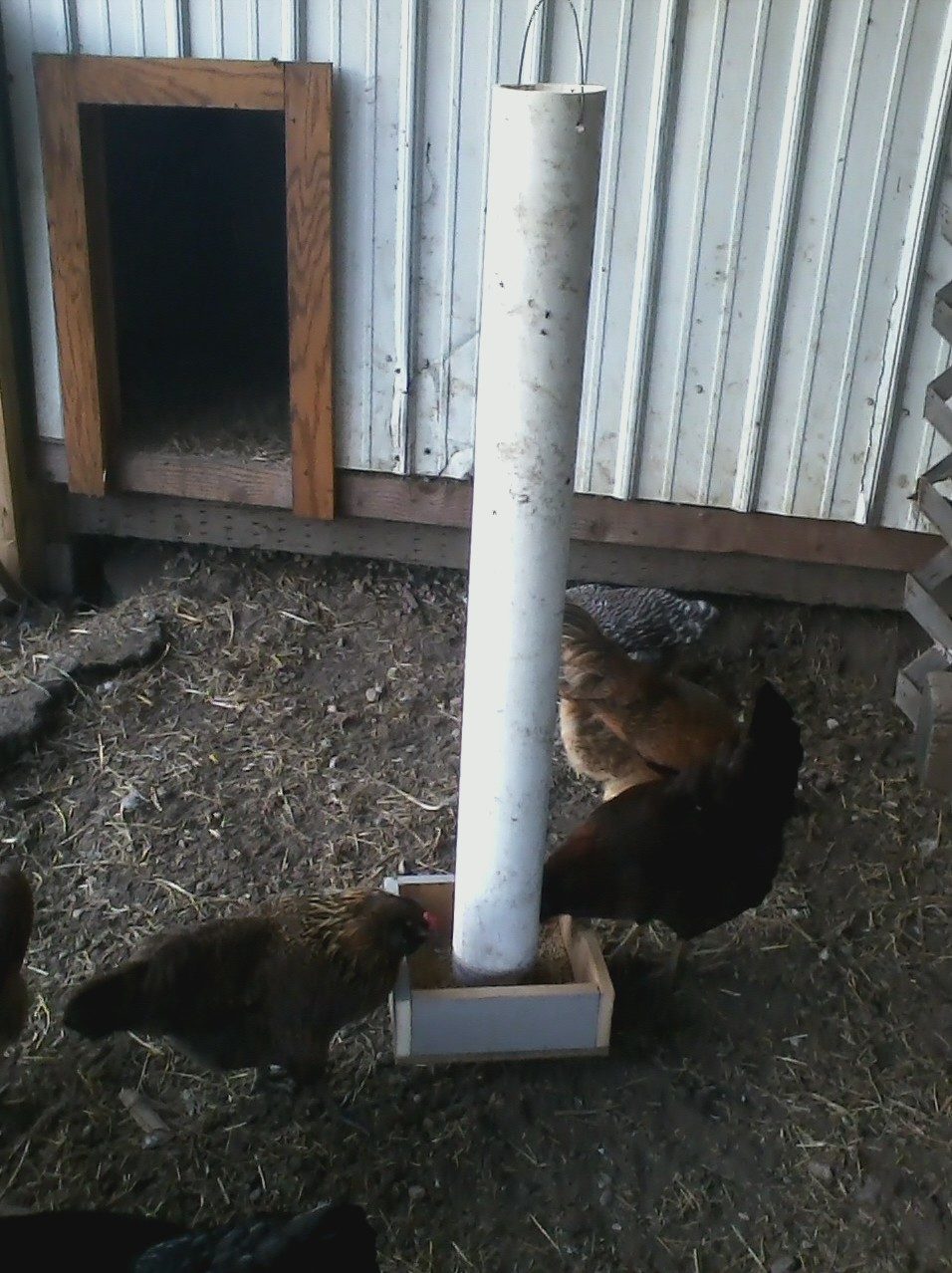 Today I got a crazy idea to make another feeder. I had just put perch rails in the run and had a piece of wood leftover. This is a double leftover scrap job. This is what I made...