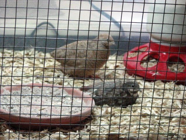 They have a big long to hop over/perch on/run under (they do all three), mealworms to forage for in the morning, a big sand bath, and a round feeder with multiple feeding holes to reduce squabbling.