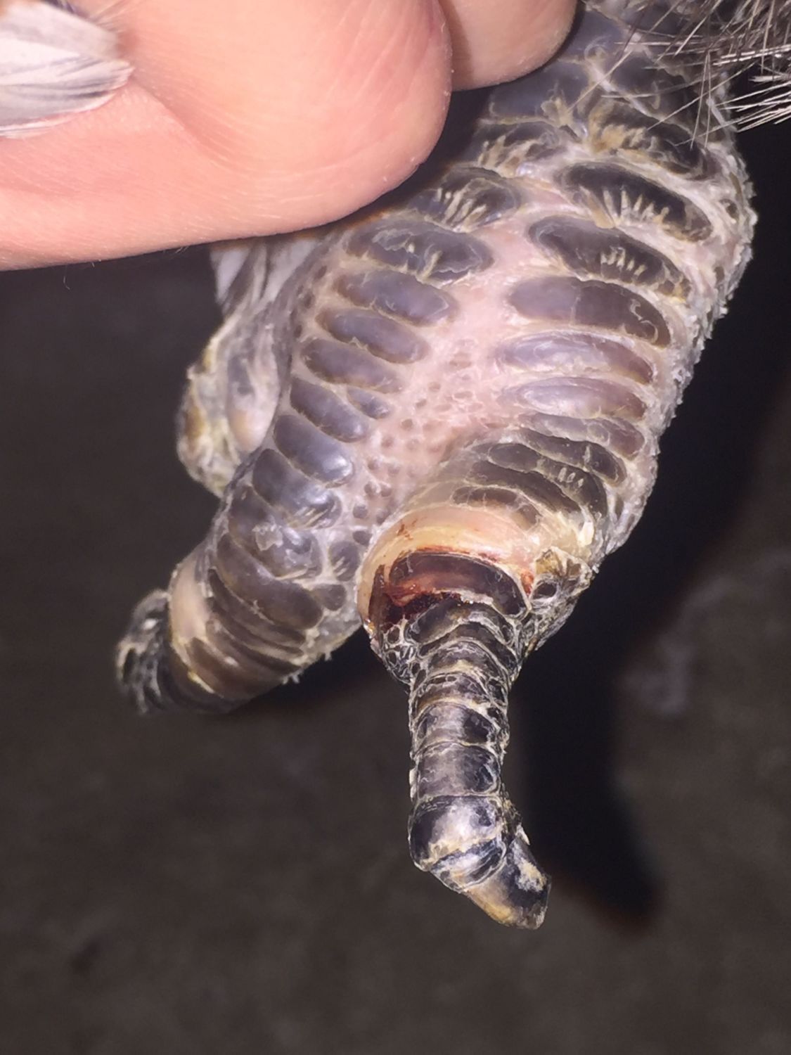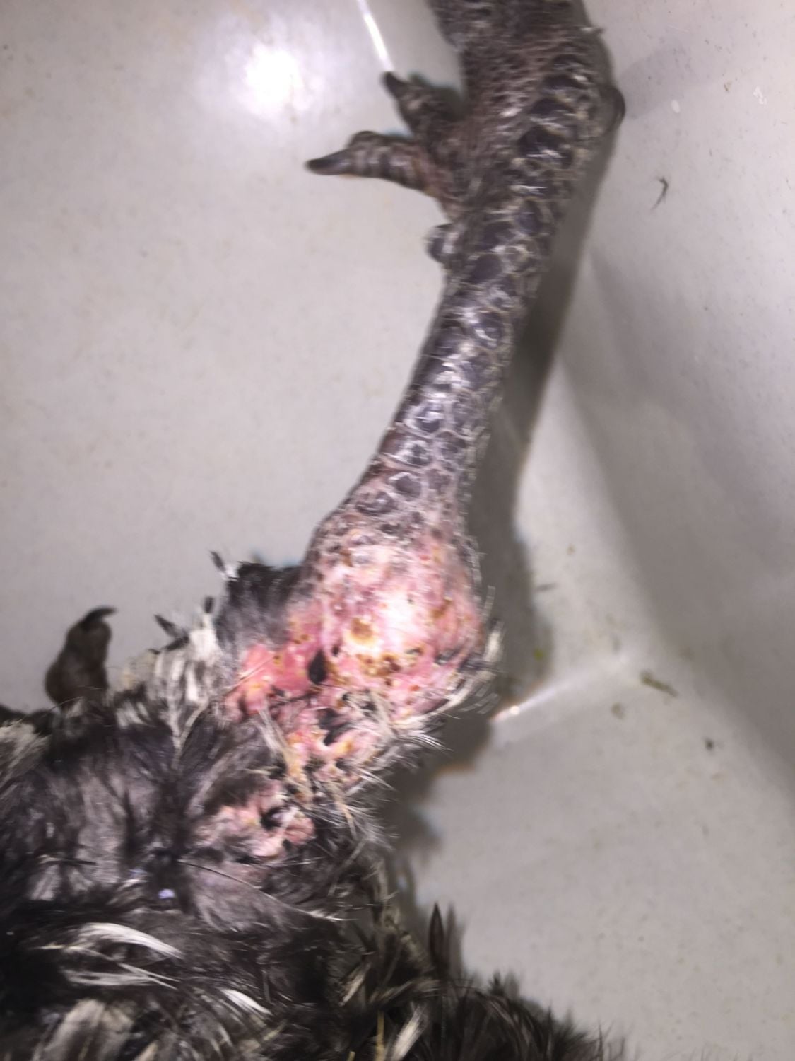 Something like Vetericyn would be good for wound care. It would be good to find the cause of the problem, whether it is a joint infection, or something like frostbite. Do you see any signs of an abscess or something that needs to be drained?Thank you! She hops on her one foot and uses her wing. Would antibacterial spray work on her foot?