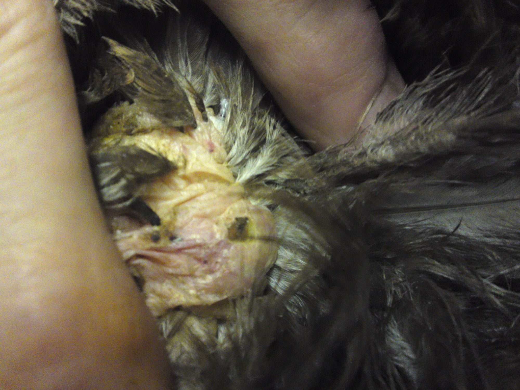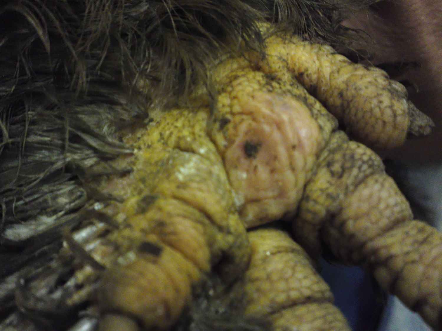 I'm quite new to chicken-keeping and enjoying it hugely. However, 2 of my girls were rescued from grim conditions....free range, but filthy and neglected. These pics are of my big cochin, and whilst we seem to be getting somewhere with her leg mite prob, I'm now worried she has several bumbles. She doesn't actually limb, but she stumbles around, and I don't kniow if this is just because her feet are heavily feathered. Compared to my other girls, her feet are huge! She never perches, but prefers to sit down on her haunches; the first and third pics are of her elbows; the first, has a scab, but I can't feel any kernels, whist the other, with no scab has a hard,iregular lump, (left of pic) Likewise her foot has a small scab, but can't feel anything beneath. HELP!! Am I just looking for trouble, i.e. is it normal to get these on elbows?? Desperately need some experienced advice