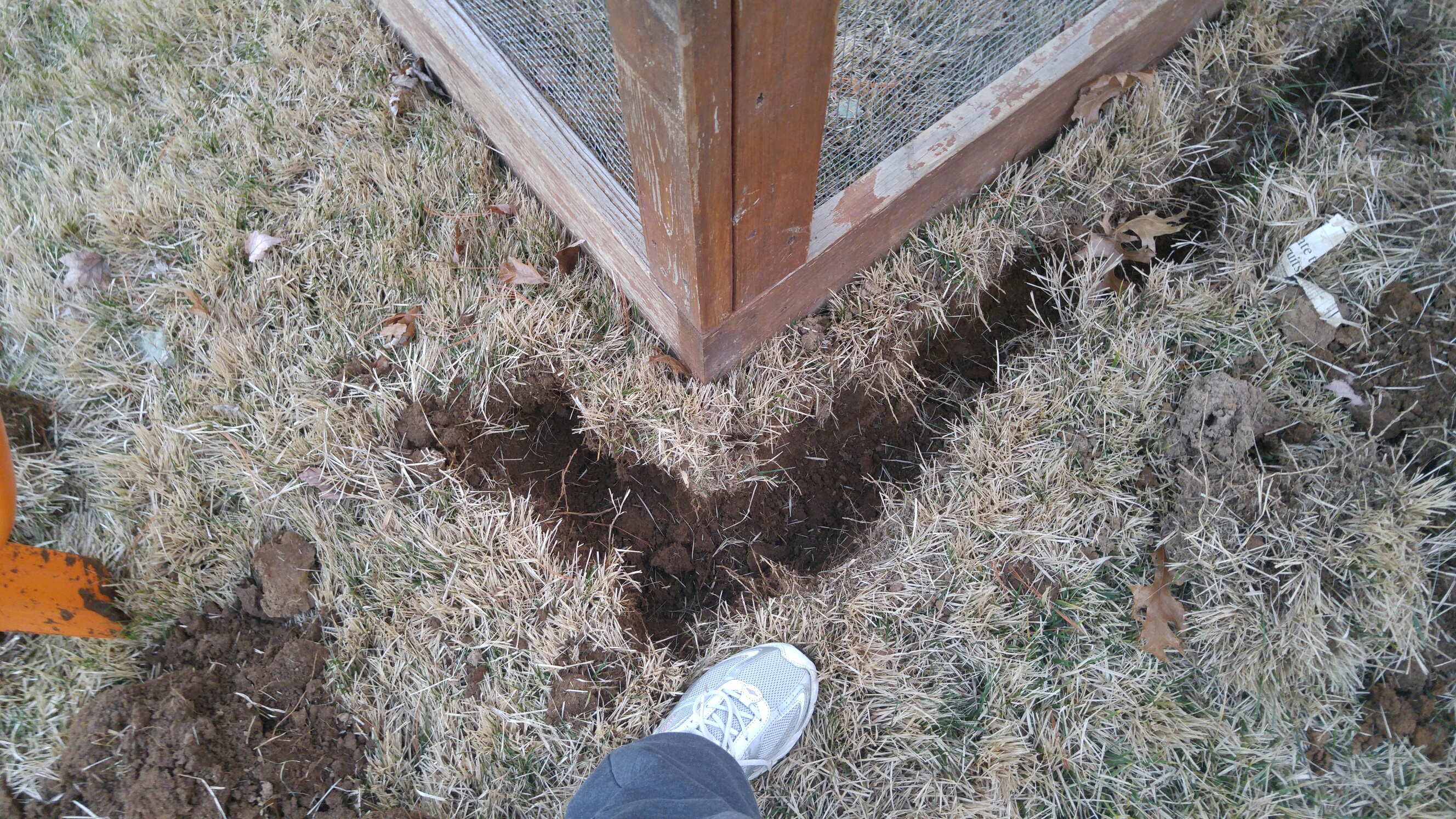 I'm in the process of digging the trench around my coop so I can bury a hardware cloth apron around it. I bought a trench shovel at Lowe's to dig it with, which is about 4 1/2" wide. I'm digging down about 12" so I can staple my 24" hardware cloth to the tops and sides of the boards at the base of the coop, lay it flat on the ground for the 6" or so between the coop and the trench, then bend it down the side of the trench, and curve the remaining 6" or so out so it lays at the botom of the trench curving outward. Once it's in place, I plan to replace the dirt and sod, cover it with pea gravel, then I plan to build wooden planters that are 12" wide and 12" deep to be screwed onto the base of the coop and to cover where the trench is. I'm attaching a pic of the trench I've started with my foot beside it for comparison. Am I doing this right?