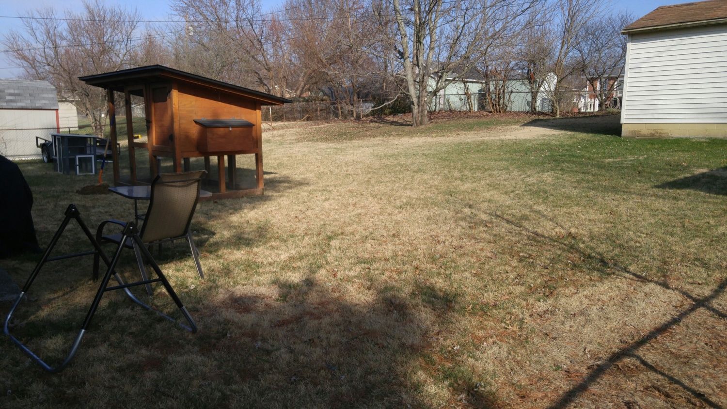 Also, Im including a picture of my back yard. In the picture, I was standing in the front corner of the yard when I took the picture, and looking across the the yard diagonally to the far back corner. As you can see, other than the large maple tree in the back corner, there isn't anything in the yard to give protection from hawks or owls. I will have a vegetable garden on one side (the spot where I'll have it is hidden by the coop) where I will definitely have some squash plants the chickens can hide under. But what are some other things that I can plant that aren't toxic, will grow fast, and will provide some protection for them to hide under? I'm in Central KY in either zone 6 or 7, depending on which chart you look at.