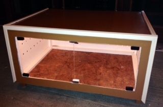 There is vinyl tile on the floor for easy cleaning, foam on the ceiling, plexiglass doors closed with magnets and rope light for ambiance.