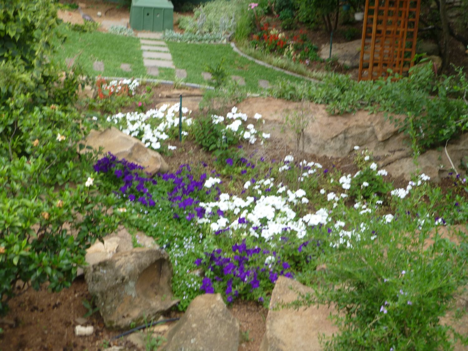 The boat now sitting in the driveway is a Hobie 17 Sport. If I have understood Critter's rapturous warbling, the 17 was designed to be raced by one person, while the Sport version was somewhat re-engineered to accommodate 2 (but does not require a second crew) and was more for recreational use. He's really not into racing, but he does like going fast. The 49'er was guaranteed swim time; hopefully, the more stable design of the twin hulls will allow Critter to get more time on the water and less in it when he goes out. When he got the 49er, I told him I wasn't ever going to set foot on that boat, but this one I might - we'll see. I'm a bit of a "fair weather" sailor, and this thing was originally built to go fast in high wind, which is not my cup of tea at all.