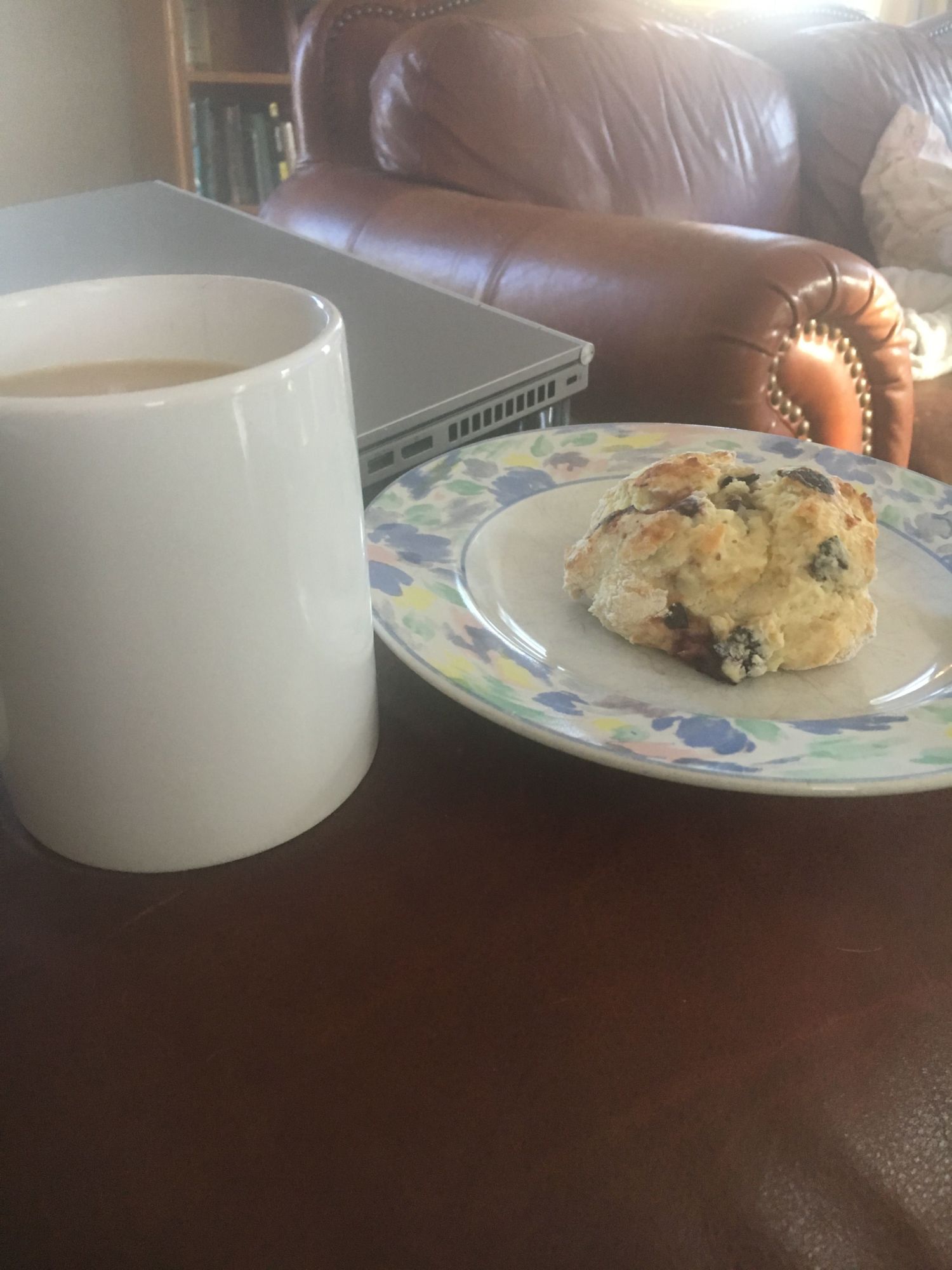 Enjoying a cup with a warm blueberry scone I made this morninfand i have my constant companion by my side. Well constant companion when I have food