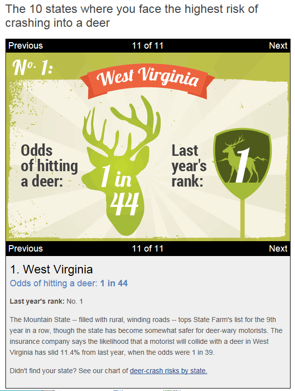 West Virginia always ranks up there in the car vs. deer crash statistics. <knock on wood> I've only ever ran over one just after it was hit by the car in front of me, but more near-misses than I care to think about.