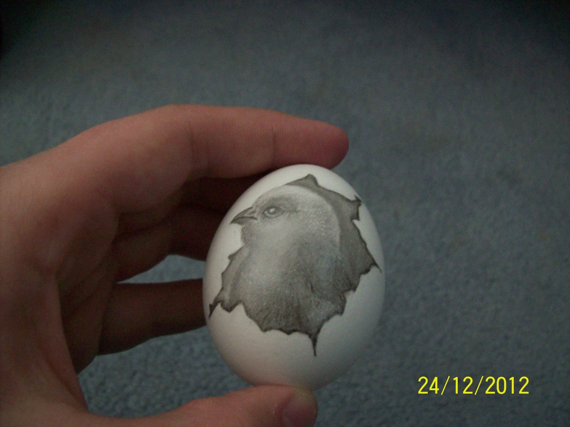 Here's a quick egg drawing. It's not the greatest, but I think it looks petty good for an hour's work. The sad part is that I set it on the couch when I went to upload the pictures and someone sat on it, so it's now in the garbage in about 25 pieces. At least I have the pictures, but I wish I still had it because there are a couple of things I'd like to change.