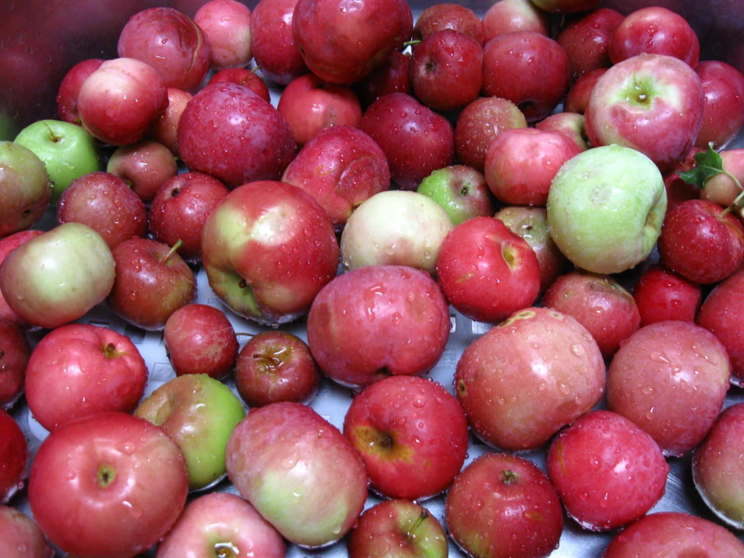(Any guesses on what kind of apples these are? One's light green that ripens with bright pink shoulders...perhaps a gala?. The other is just red, but not a red delicious. We have a red delicious at streetside)