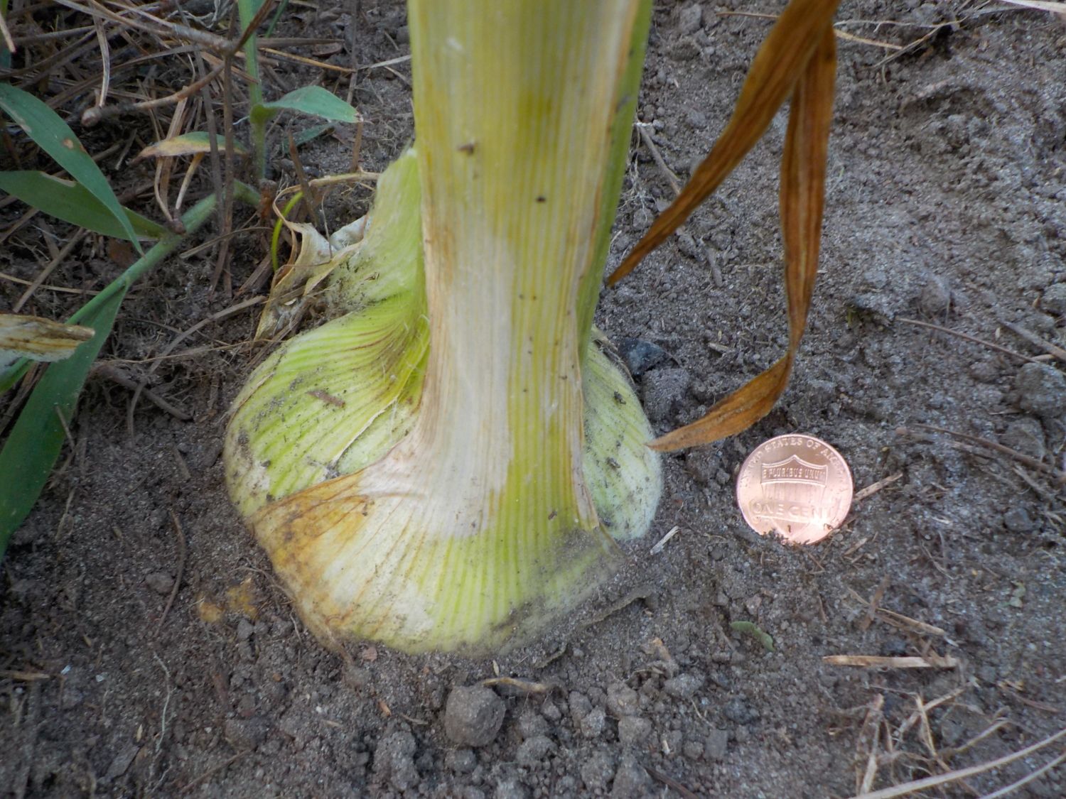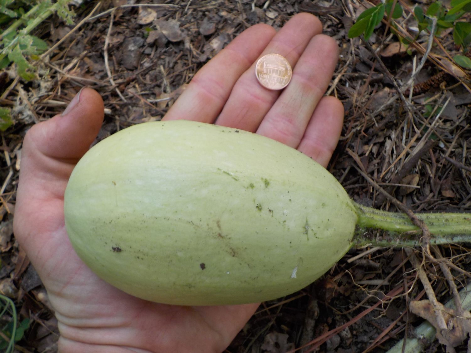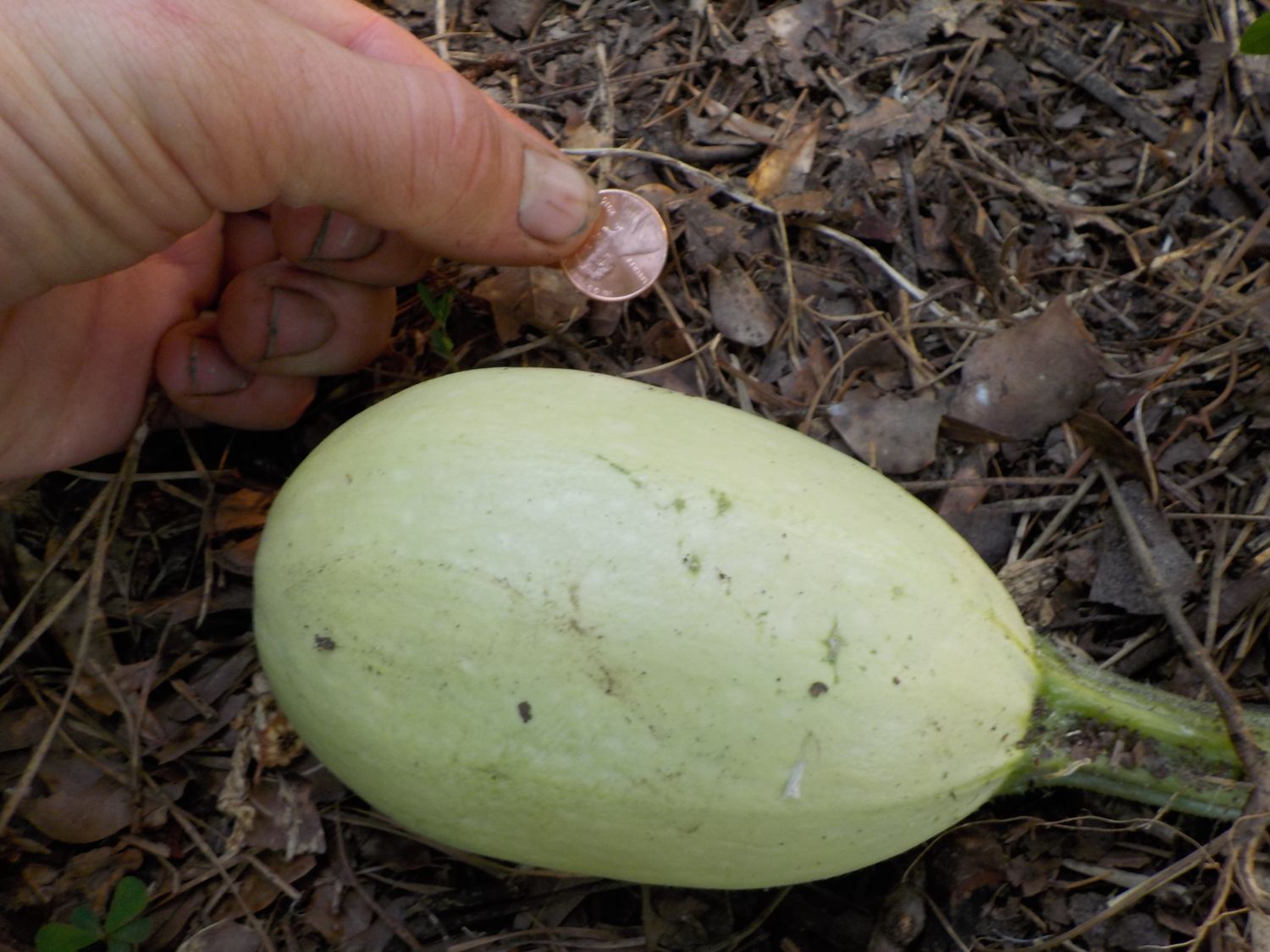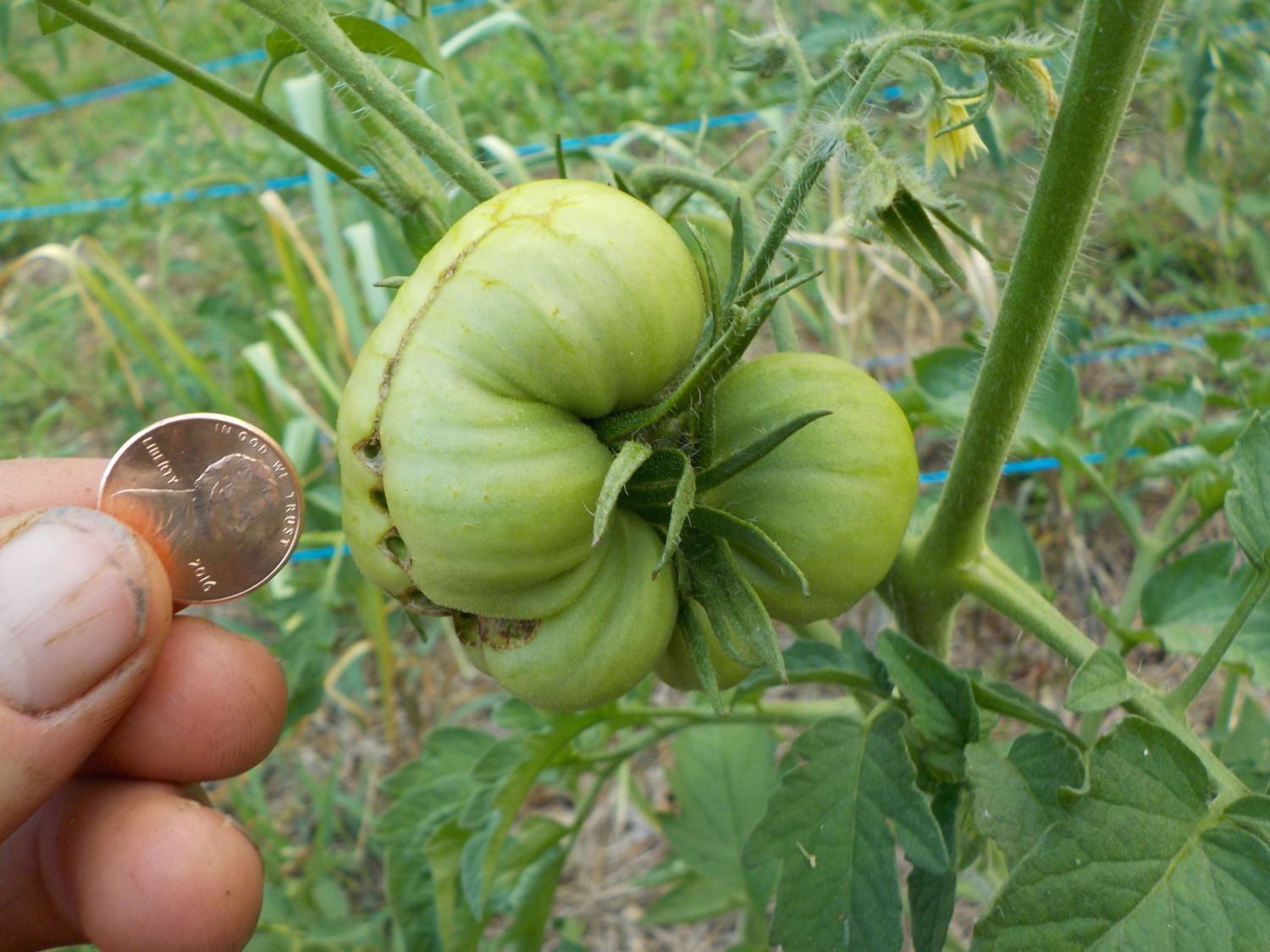 Cherokee purple. (I couldn't find my quarter) A really cool tomato I'm growing for my sister called Blue Berries. (Also Indigo Blue Berries.) Elephant garlic Straightneck squash. Volunteer squash.