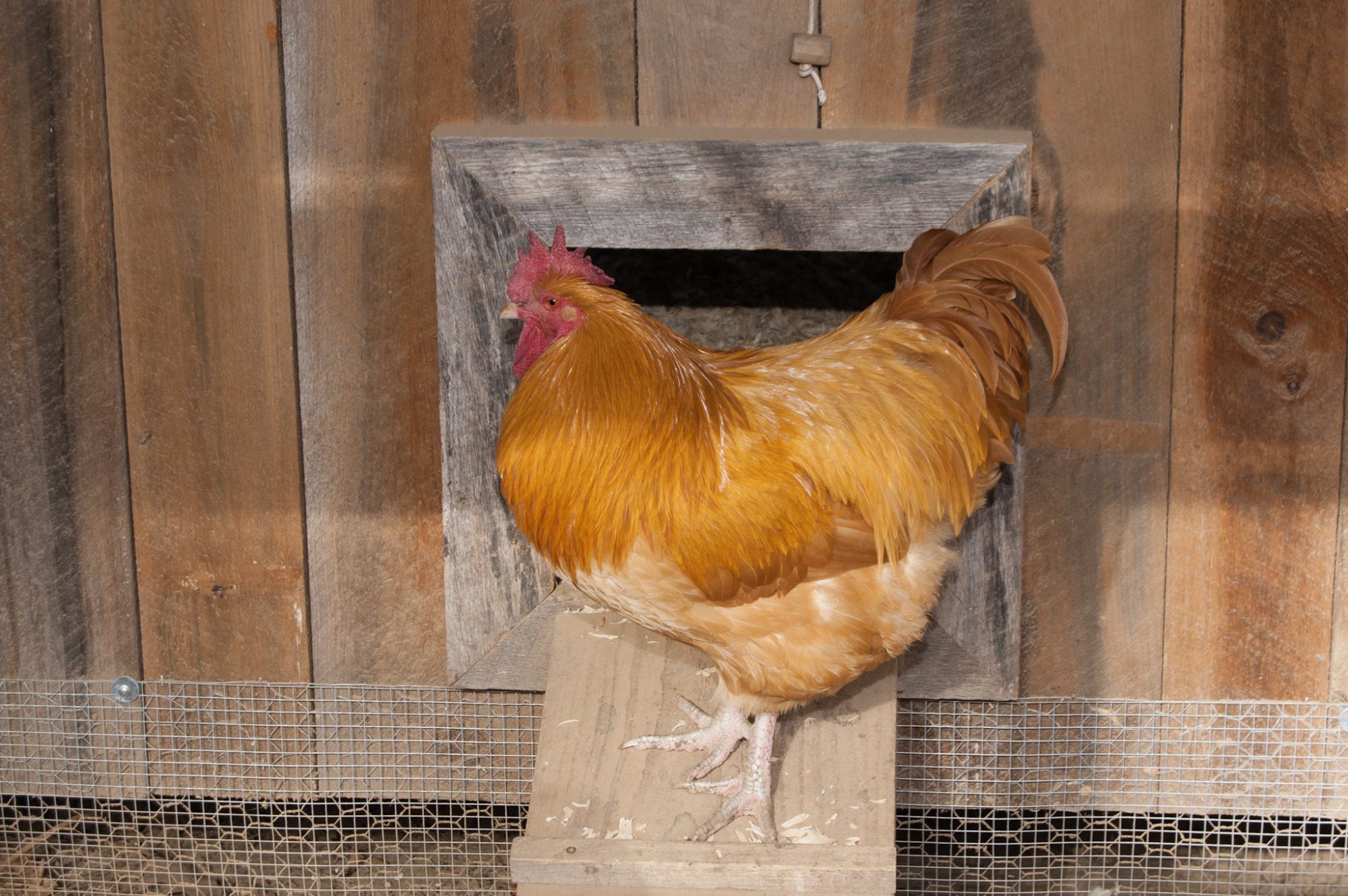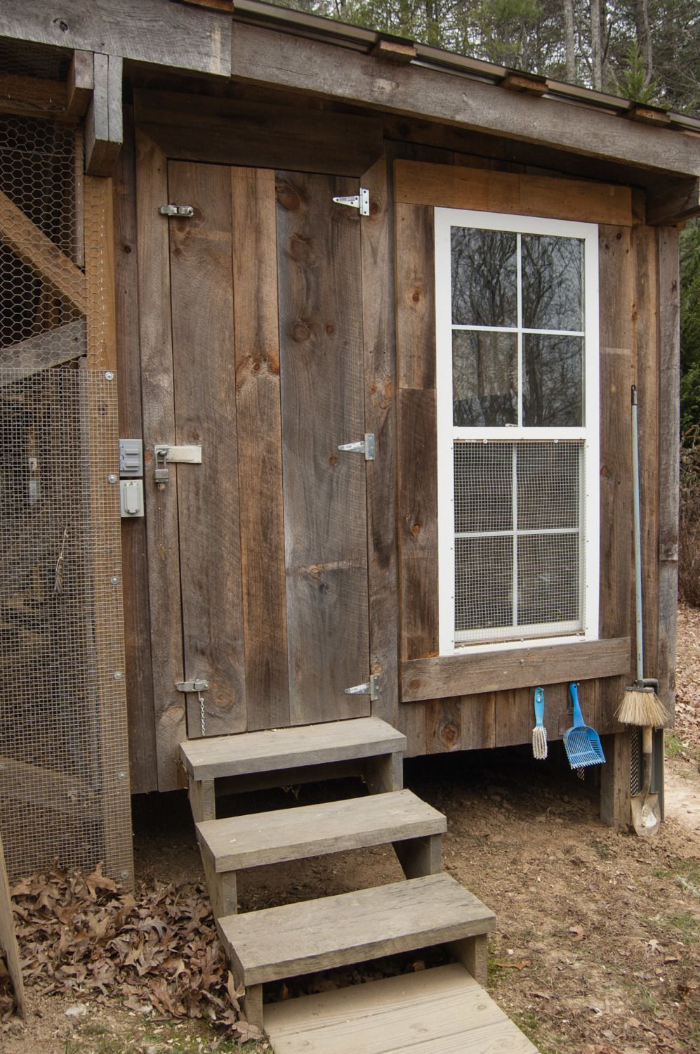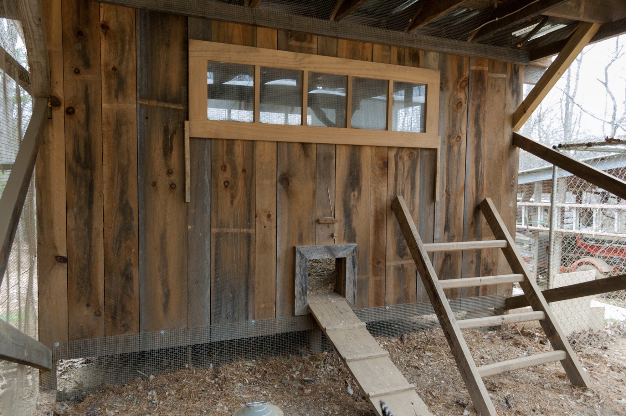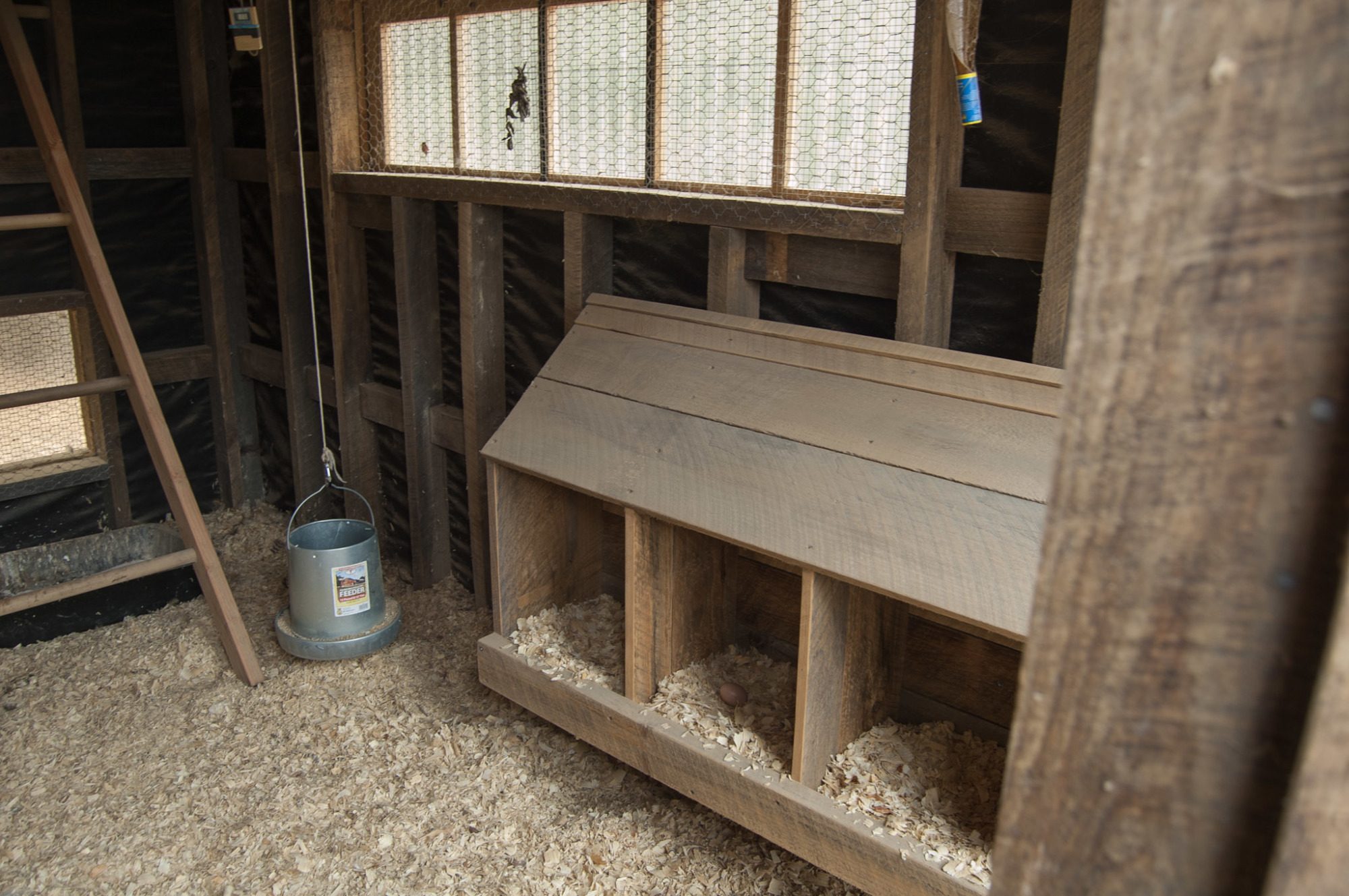 I love the old rough cut lumber we used to build our coop. Hubby made the door, nesting boxes and outside ladder perch out of the same materials.