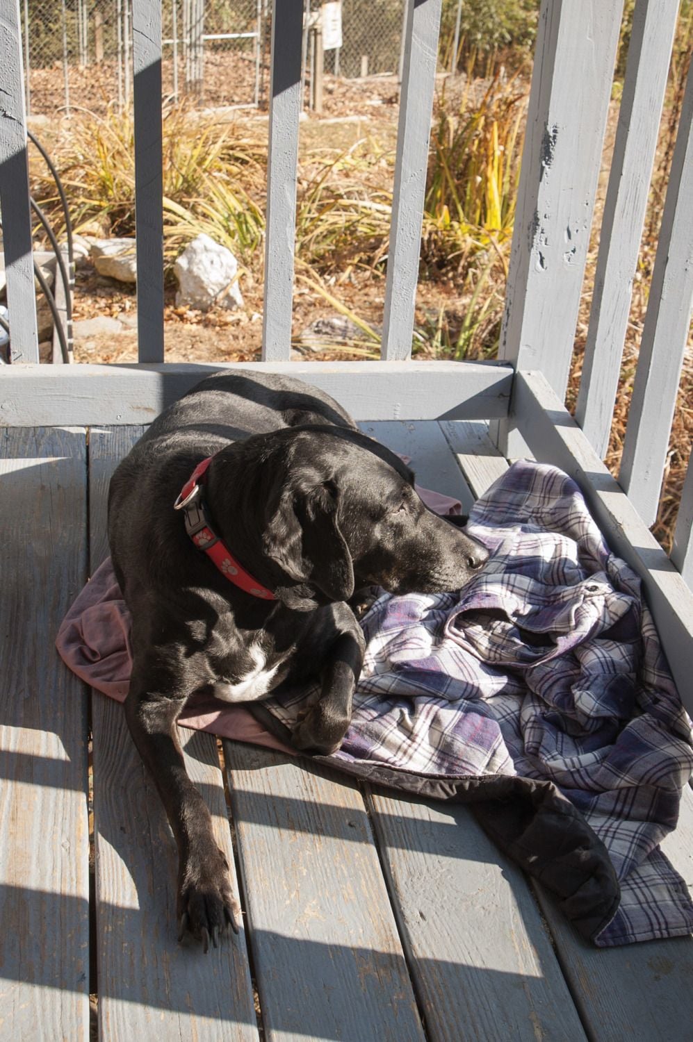 I have a 12 year old mixed lab named Buddy. He slowing down, but loves to take daily walks to the garden and lay on the porch on sunny days.