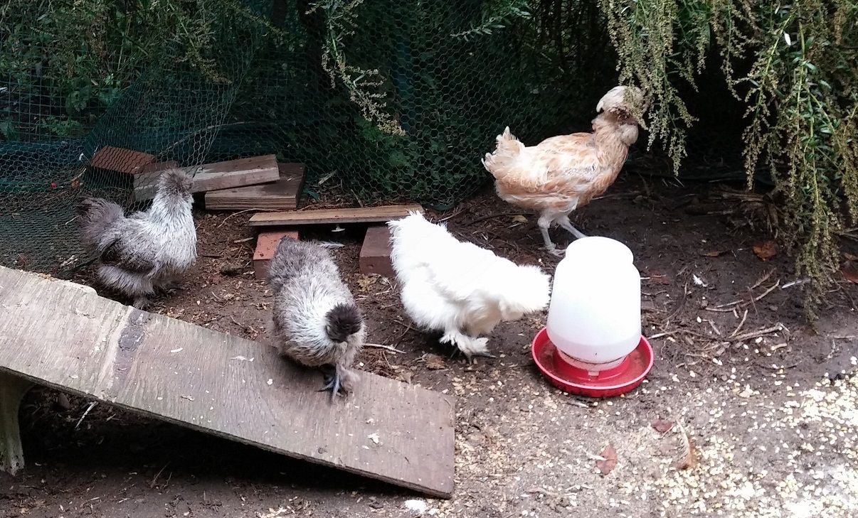Here is one picture of them from a while ago, along with a half naked buff laced Polish. These are hatchery birds. They are smaller than silkies from a breeder, of which we have 2. Unfortunately during this picture they were in the coop brooding. The hatchery silkies are a little spazzier too.