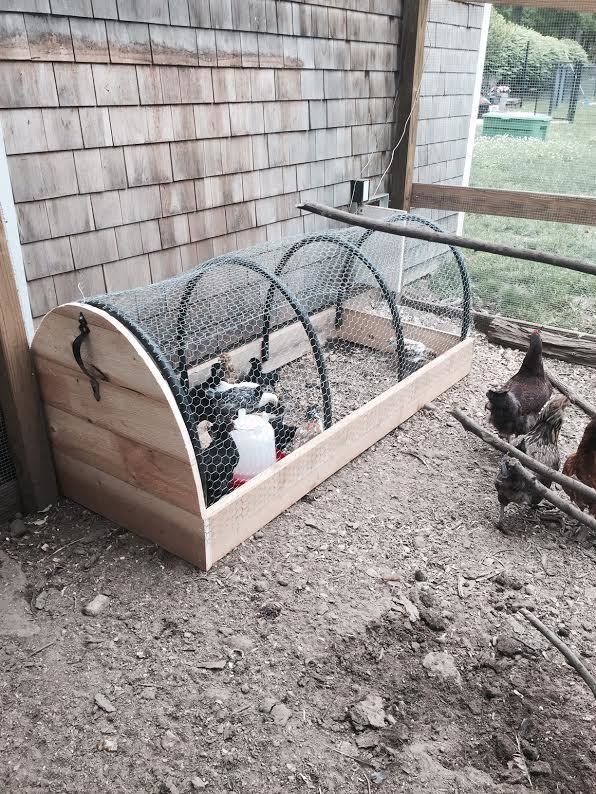 My boyfriend built a small chicken tractor that went into the run. It was big enough to house the pullets, a food bowl, water bowl, and gave them enough room to walk around freely. As they weren't familiar with roosting yet, we just used a rubbermaid container with a half circle doorway cut out of it at night. It just gave them a place to sleep that was enclosed and out of the elements.