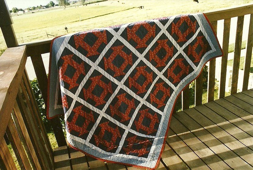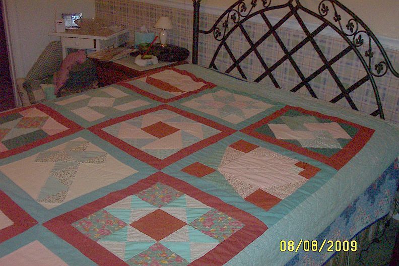 This was the second quilt I ever made back in the 80's, hand pieced and hand quilted, didn't own a machine. The first was a churn dash in navy and maroon for my son's twin bed, but I must not have a photo of it. They were both full of mistakes, but quilts don't need to be perfect to be loved or to be beautiful.