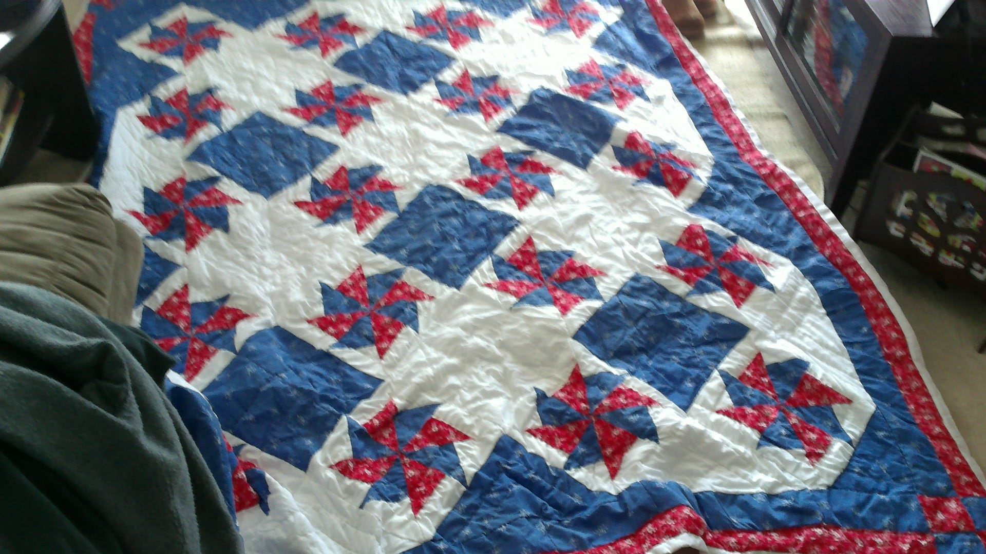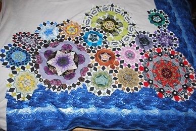 I thought since everyone is sharing I may as well share my fiasco! I started this in 2005 and put it down a few years later (2007) then started up on it again in 2010 and of course, put it away again because of moving. I never got back to it until about 3 weeks ago and have been sewing like mad! I have 2 large blocks to finish and I'm done with the top. It's called a Nickel Quilt and this one is called Idaho Beauty. AQS I belonged to started it and I am so pleased to have it almost done. It'll be a queen size-in the picture it's folded in half -so I'll have to send it out to have it quited. I still have some rows to sew which is why some look crooked. I'm not an expert and have taught myself so be gentle on my ego.![]()