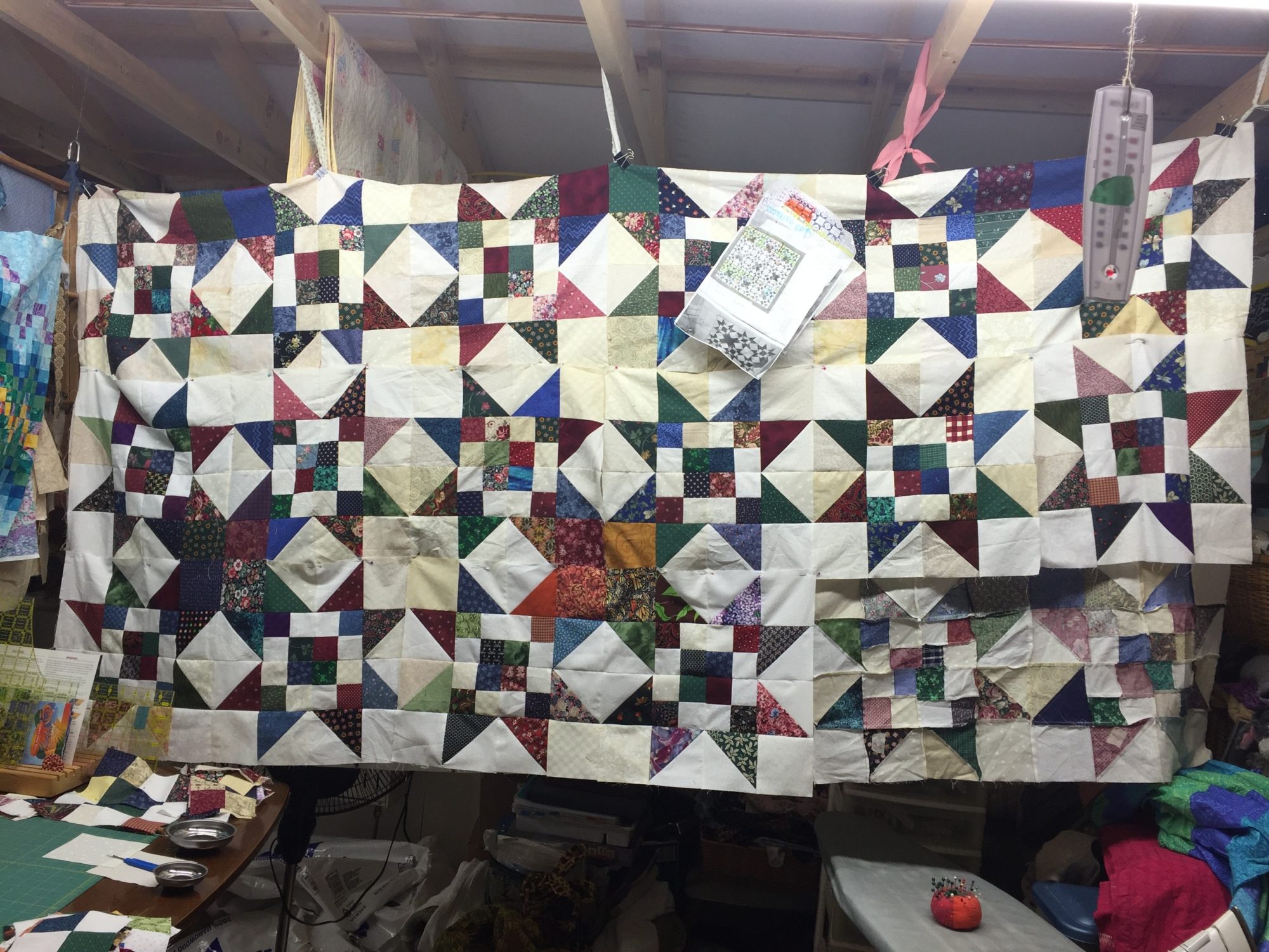 I love this scrappy quilt! You've done a very nice job on it and I'm sure it feels oh-so-good to finish up a project that has been around for awhile. I just finally sent a wedding gift quilt to the quilters that was started in 2004 (good thing, they are still married).I thought since everyone is sharing I may as well share my fiasco! I started this in 2005 and put it down a few years later (2007) then started up on it again in 2010 and of course, put it away again because of moving. I never got back to it until about 3 weeks ago and have been sewing like mad! I have 2 large blocks to finish and I'm done with the top. It's called a Nickel Quilt and this one is called Idaho Beauty. AQS I belonged to started it and I am so pleased to have it almost done. It'll be a queen size-in the picture it's folded in half -so I'll have to send it out to have it quited. I still have some rows to sew which is why some look crooked. I'm not an expert and have taught myself so be gentle on my ego.![]()