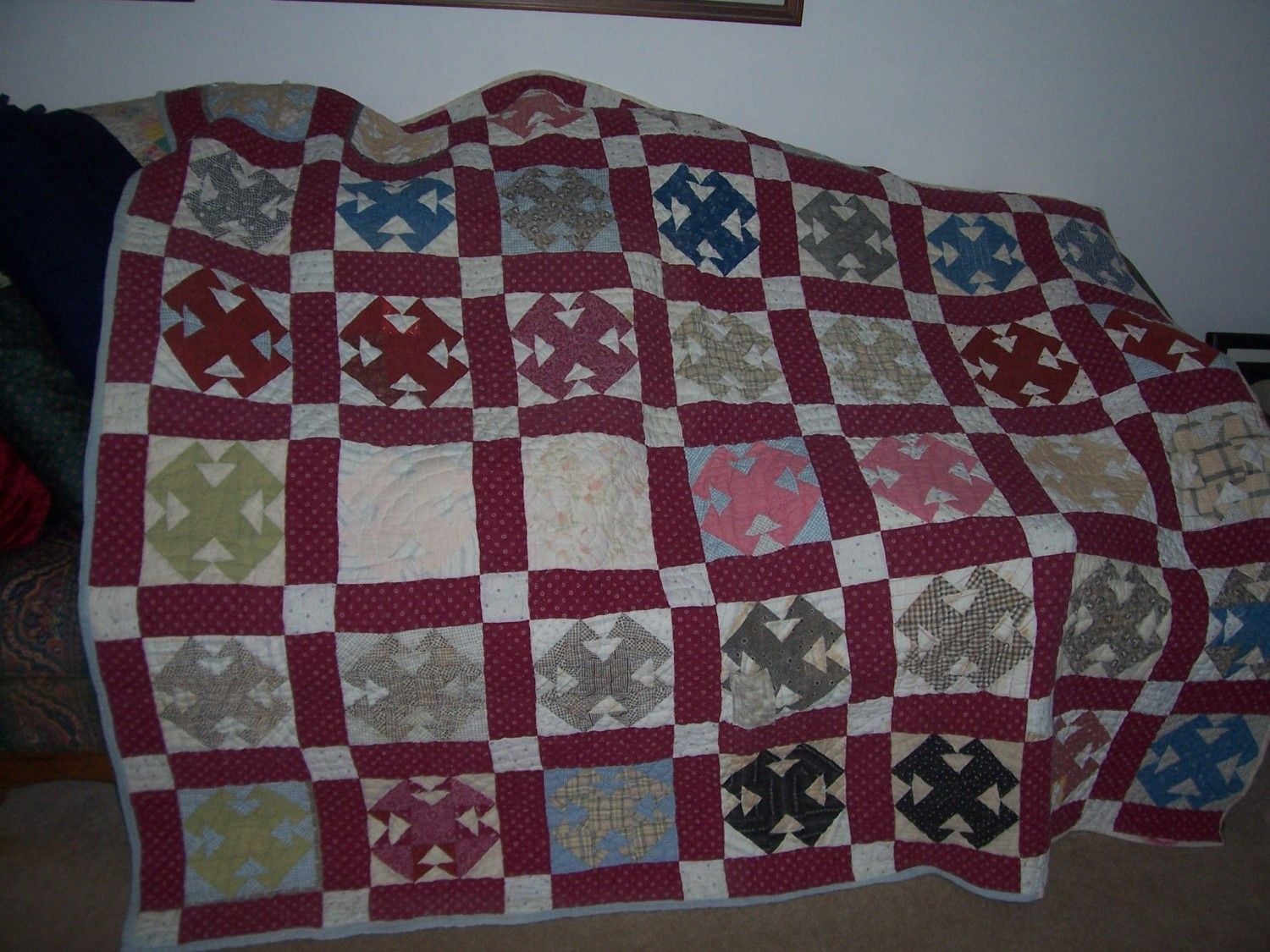 My husband's Aunt Sis died 10 years ago at the age of 93 and we have recently received a quilt made by her...years before from a cousin. This quilt was made from feed sacking fabrics and is hand sewn and hand quilted with many patches from use. There is a little fading on some of the older fabrics but her handwork is beautiful. The borders were from different colored fabrics. The thread for quilting was the cotton thread from the feed sacks and is done in the rainbow shell contour from the old timers. It shows how nothing was wasted.