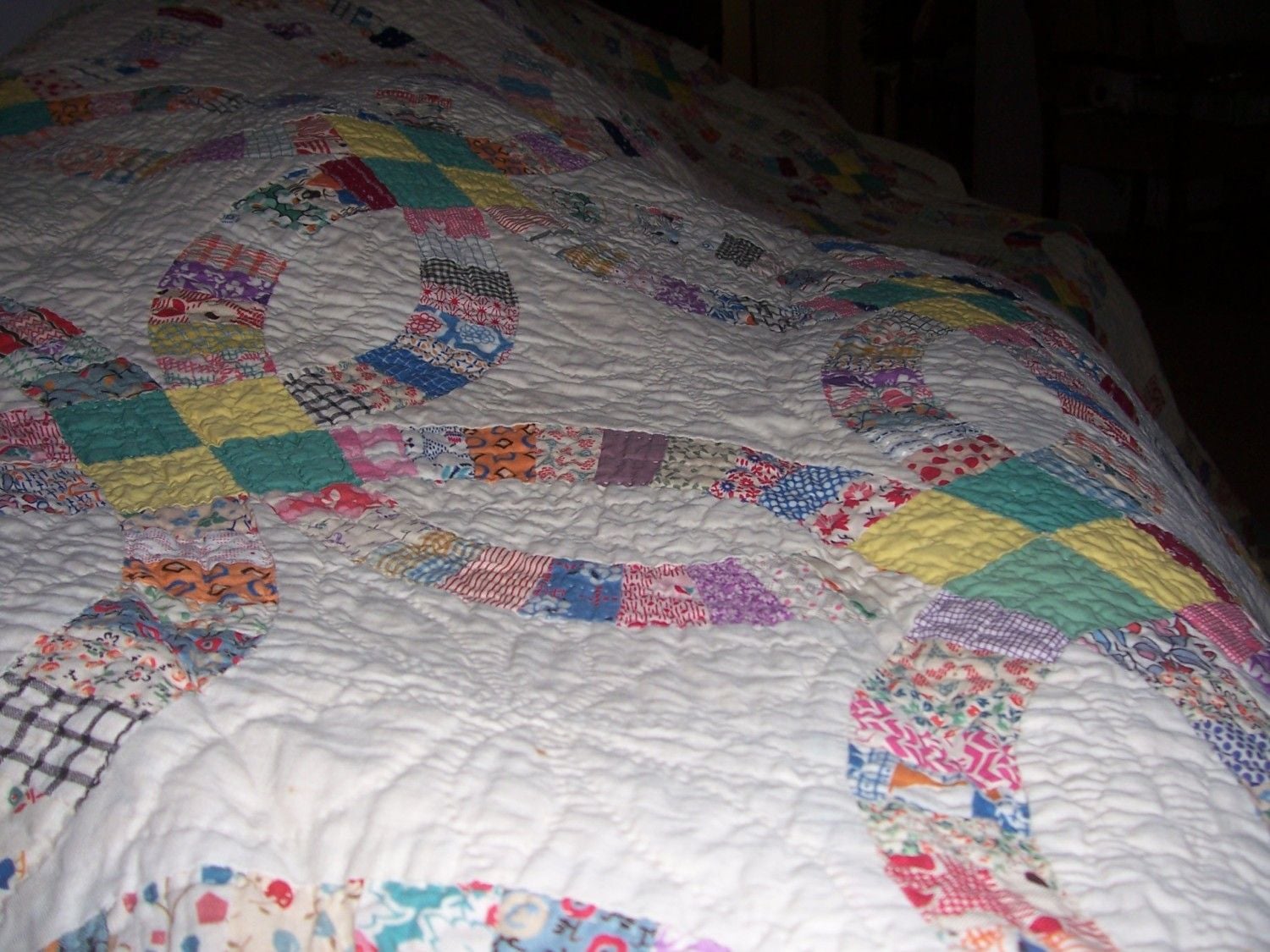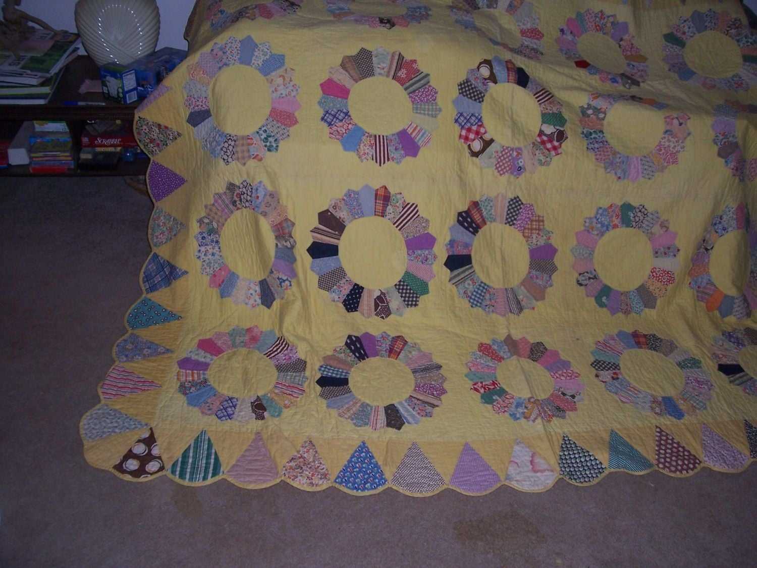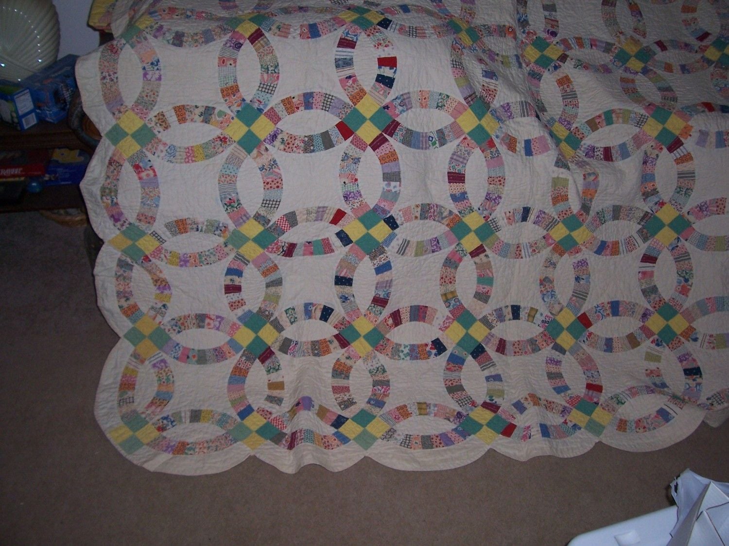 This beautiful Wedding Ring pattern full sized quilt was hand sewn and hand quilted. It was priced $80 at a flea market. There are hundreds of pieces. The hand stitching is beautiful...very tiny stitches both in the stitching and the quilting. . Each section has many 1 inch wide pieces used...the fabrics are all flour and feed sacking cottons. I love the scalloped edge that mirrors the rings.