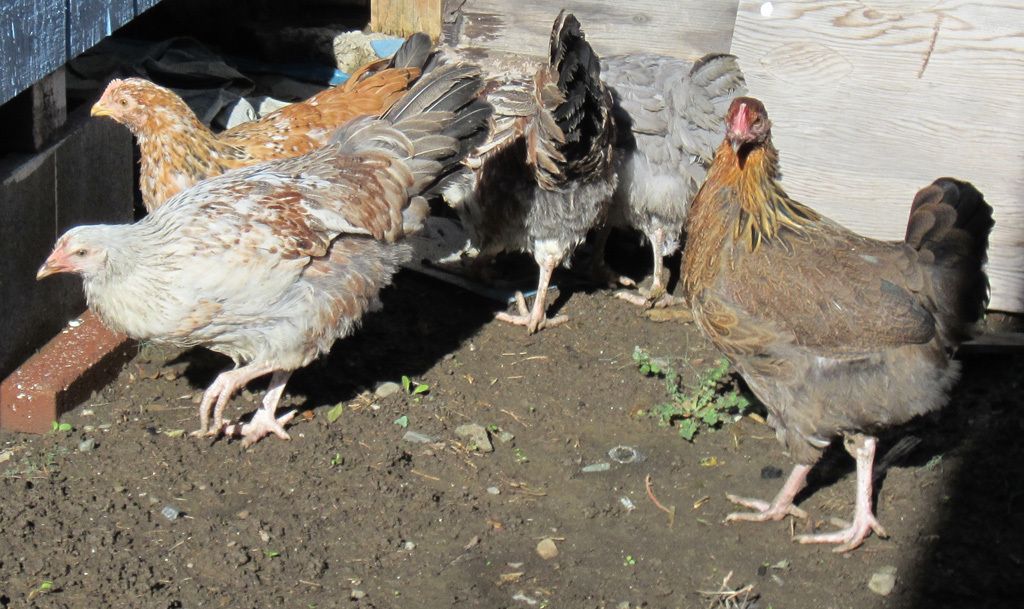 These are chicks from the small pen that I am working on today. The Orange looking one on the left is an EO Basque. The ones in the middle are three of the Dorking Xs. Two look like RIR crosses and the gray one is crossed with Miranda. I also have a black rooster with cream colored hackle feathers from that cross.