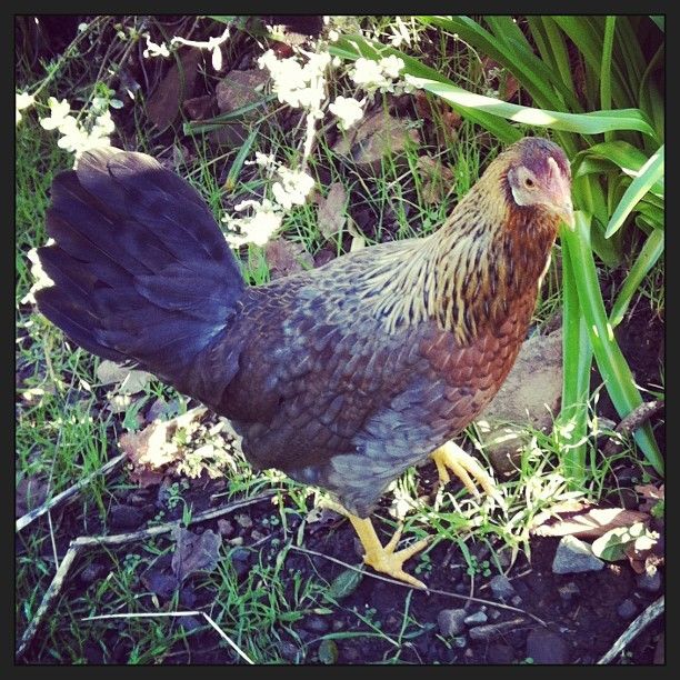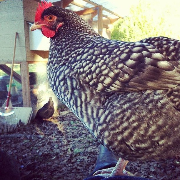 and just for the heck of it, here is the lovely Ethel, one of my cuckoo marans, who are now 30 weeks old & still not laying -- BUT she did a bit of a squat today for the first time, so maybe they're close! she's perched on my leg, hoping for a handout of treats: