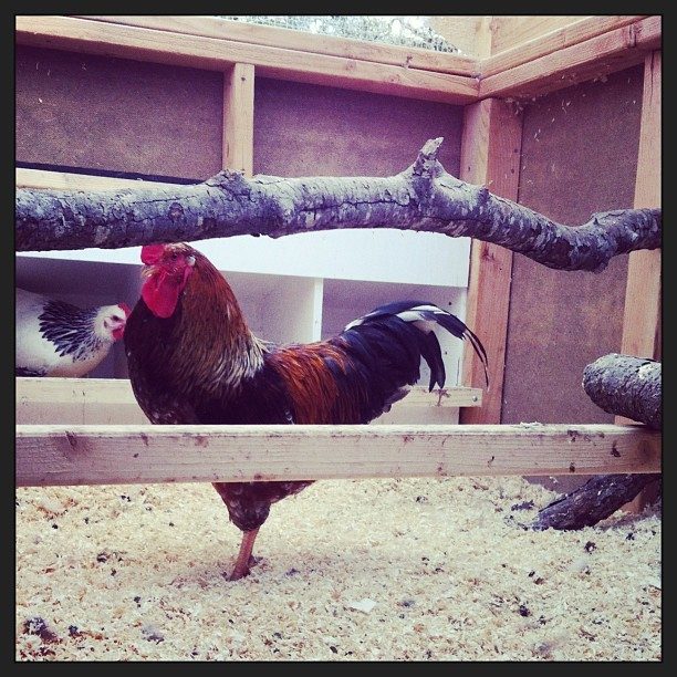 welcome HippiAiti! i lived in oakland for many years before moving up here to Sonoma Co -- but only recently got into keeping chickens, so can't be of much help in that department. but more news from here -- i took my camera down to the coop to snap a picture of Max guarding the would-be layer, Jane -- here they are: and look! it's egg #2, still warm! a little smaller than the first one and less shiny -- but wow, never any eggs before and then suddenly two in one day! and I'm SO pleased that Max is such a gentleman -- surprised he's not handing out cigars!