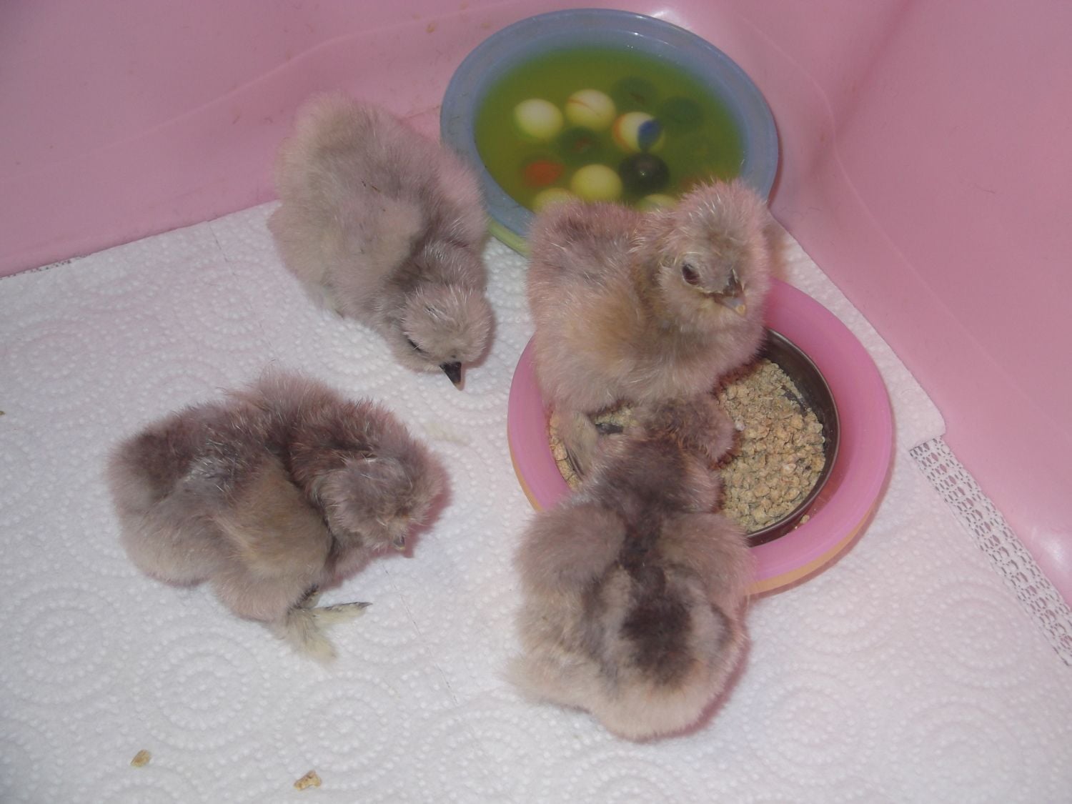 :barnie I hate when that happens! My Barred Rock has been our best winter layer too although she took several weeks off. I've been hanging onto the store bought egg cartons too in hopes that by spring I'll actually have enough extra eggs to sell. Here's what my basket of eggs looks like lately. I only get about 2 or 3 eggs per day so they add up unless we eat them everyday. Eggs from Barred Rock, RIR, Welsummer and a Silkie. I agree, it's got to be a girl..........how pretty! I finally got a picture of Mysty Blues & Mr. Puff's baby chicks. They are so precious. I put them in a pink container this time -hoping for all girls.:fl It looks like 1 splash and 3 "light" blues! :celebrate 0