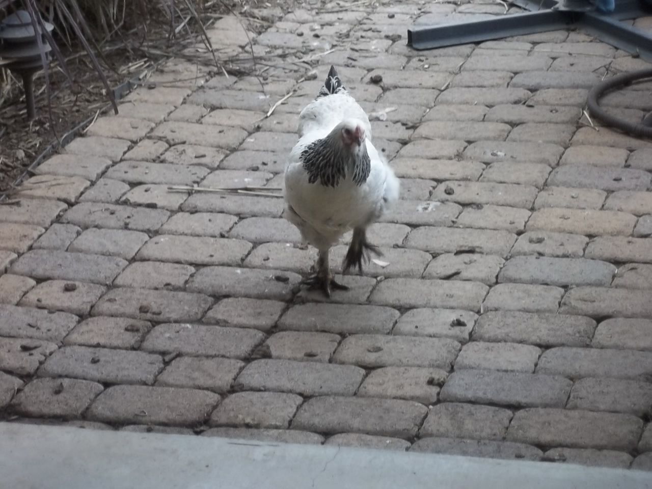 one of my layers coming up to the patio for a treat. Her name is Chubbykins and is my sisters favorite.