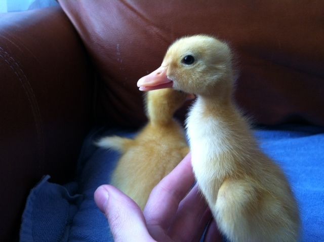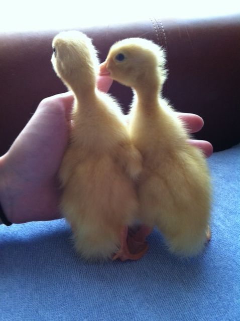 I posted on the duck forum. I figure they're probably Pekin or Buffs (I don't really know much about ducks, so sorry if those are silly guesses) but the way they stand up so much had me thinking (wishing!) runners. We'll see I guess! I have them in with the chicks for now, but I'm sure we'll move them on their own soon. I think they're four days old. They're pretty (VERY) nervous around us, I hope they warm up to us.