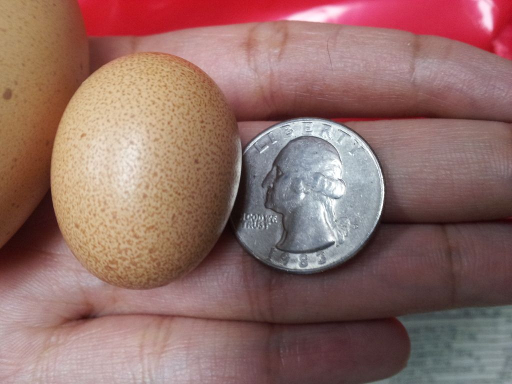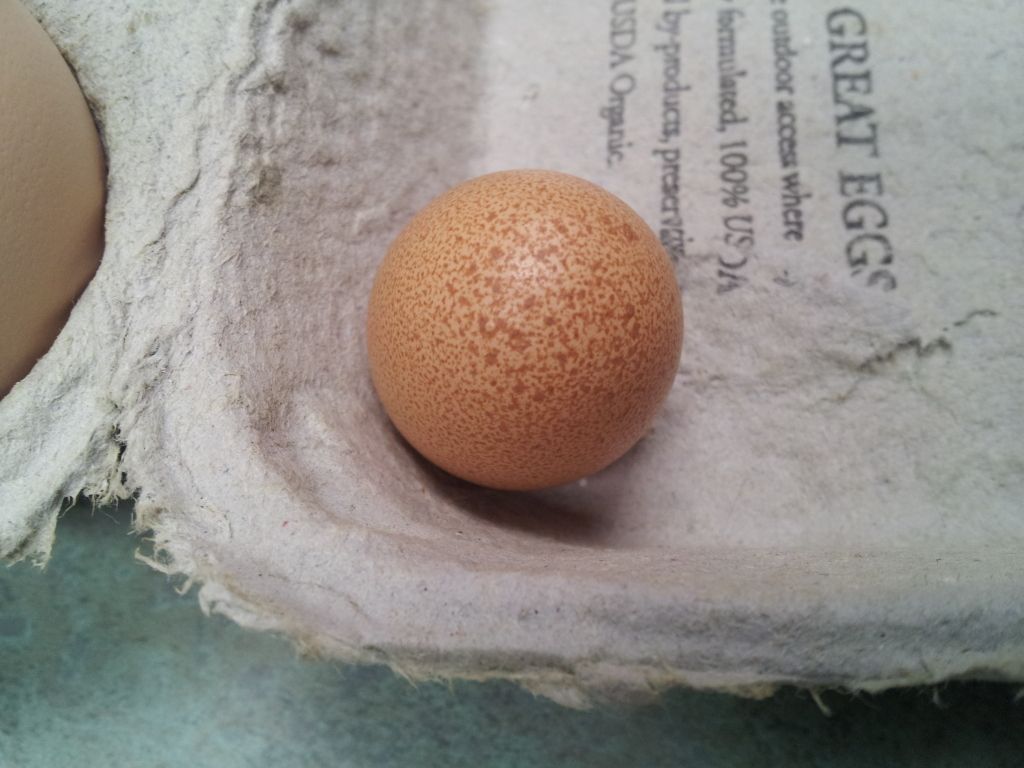 Look at this egg we found in the Basques nestbox. Its about 1/3 of the size of one of their eggs. Is this a chicken egg? Its really speckled! Really darker tham a basque egg.