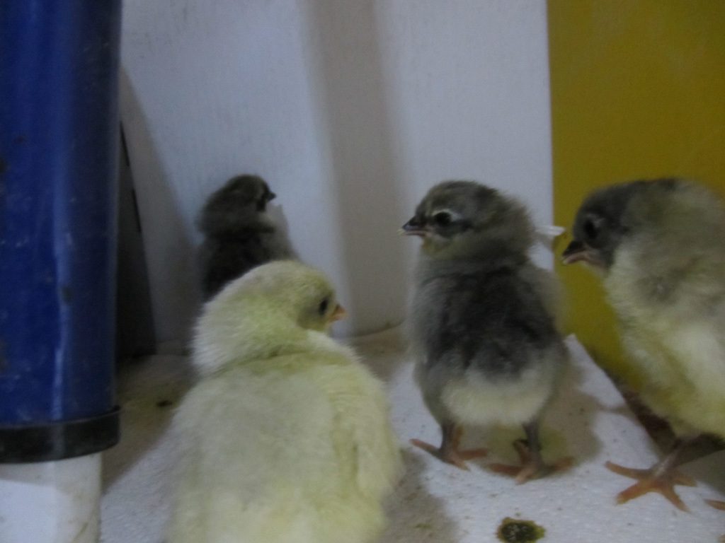 The Blue Egg layer sage continues! The one I found still in the shell with now pip stayed in the incubator over night and perked up nicely! First thing in the morning I checked on the 6 outside and found one cold outside of the ecoglow. I guess they are smaller than most of the ones I hatch. It was cold but its eyes were kind of looking at me, so I put it into the incubator with the last chick to hatch. I took one side off of the ecoglow so that the chicks could make better contact and later set up the big light for them. The almost dead one was fine and back to normal in a couple of hours and is now back with the others. They are all doing fine and I have Four Blue ones and 3 Splash ones: I am off to get them some Chick vitamins and plain yogurt!
