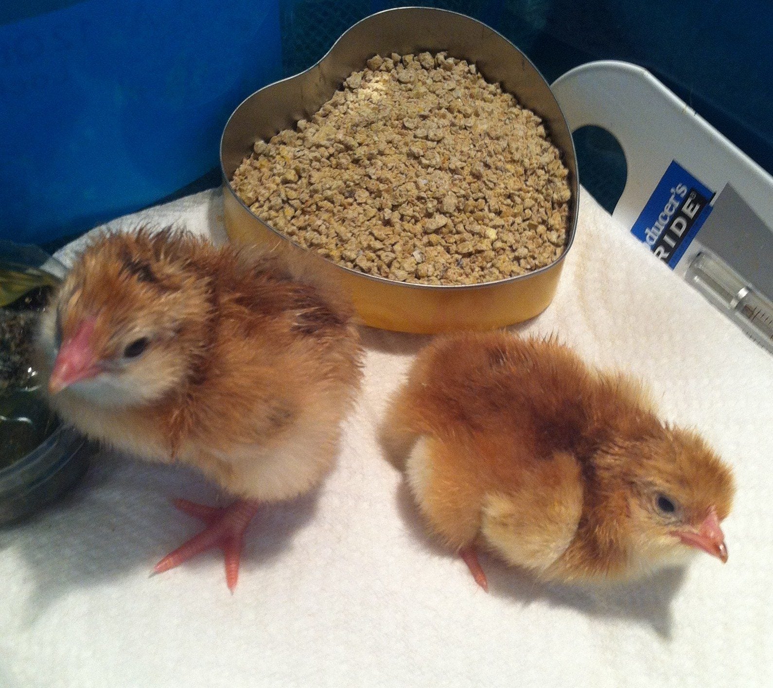 Here is a pic of them now in the brooder. Dusty still has some extras hanging onto her, but eating & drinking