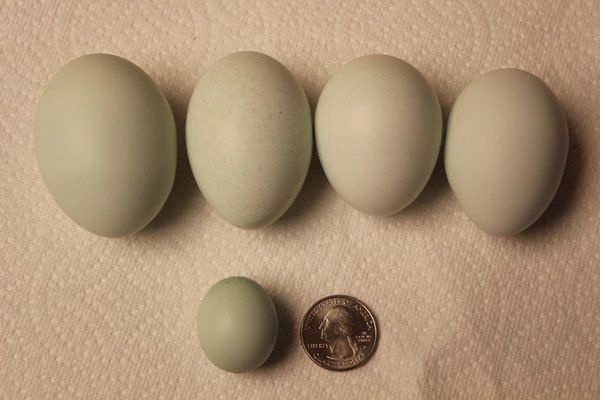 Blue eggs left to right: Cream Legbar, Blue Wheaten Ameraucana, Lavender Ameraucana, Lav Am, and the little fart egg is from my Silver AM, I think!