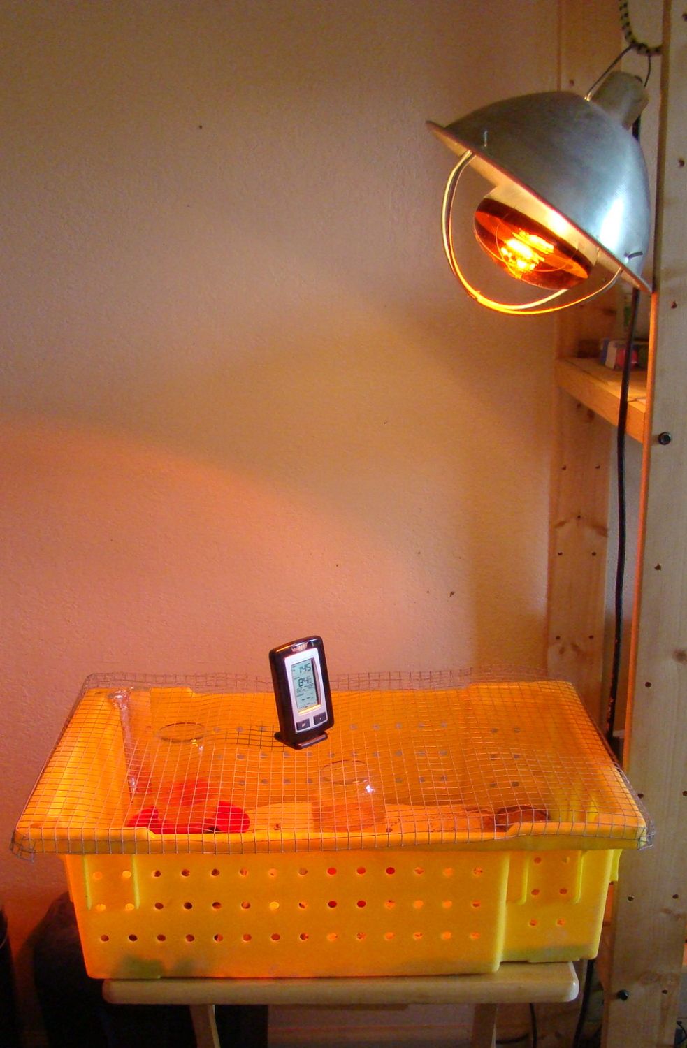 Kim got to see one of my "Urban Predator" Brooders yesterday. I need to protect the chicks from Cats! House cats that is. Two of them are in the 20# range and they like to sleep on the brooder so the plastic cutouts have fabric cloth on the opening.