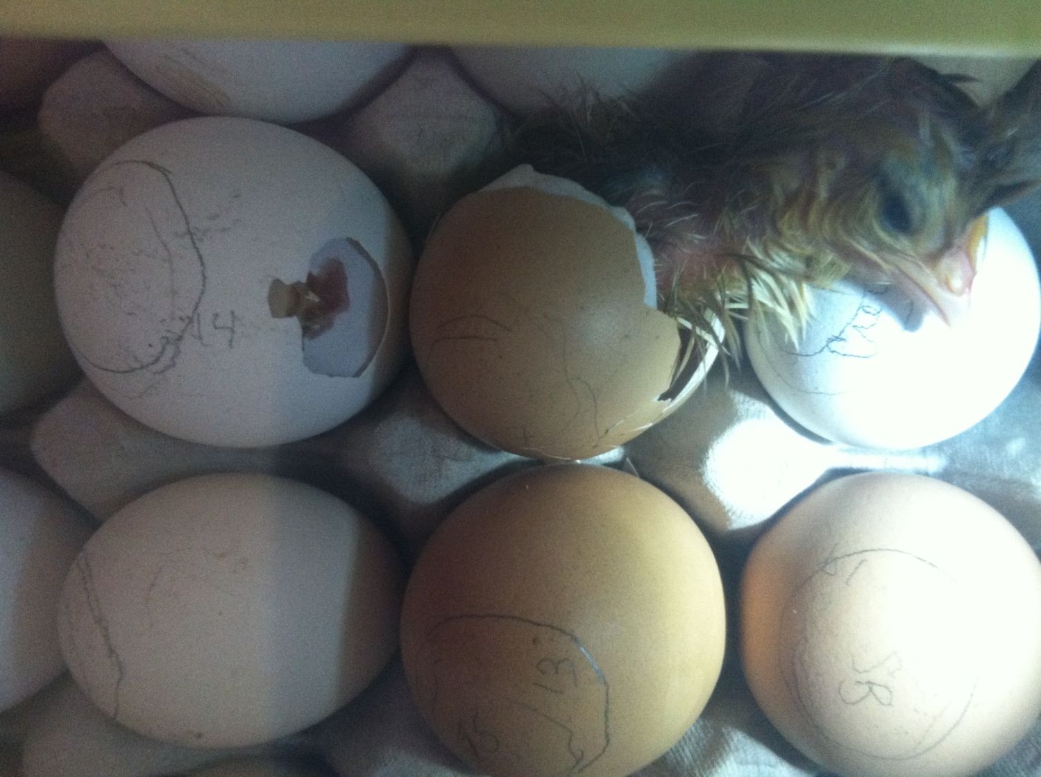 ). There are 10 other pips!! None of the store bought eggs have pipped, I wonder if they'll take longer. I have to admit this whole process has reminded me a little of being pregnant and giving birth, but without the physical discomfort. The two eggs next to the one that hatched are the most active, which makes me wonder if there's a hot spot or something. They have been moved around during their incubation, though, so not sure. The sweetest chick I have ever seen I'm feeling a little worried about the one next to it. It has that big piece chipped away and I can see it moving, but it has that off colored spot on the membrane. How normal is that? Anyway, I'm unspeakably excited and in love. I'm uploading videos to YouTube so I can post them, although the commentary is probably shrill.