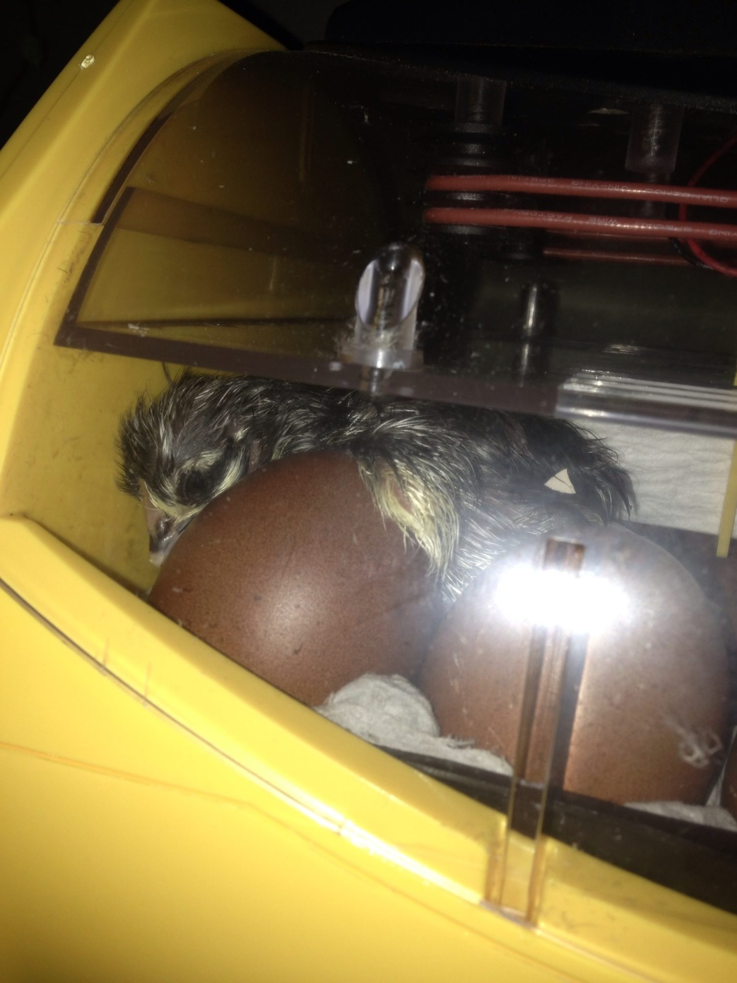 OK I am trying to remember all the questions..laura I'm betting if she is off the eggs you had one chick hatch early. You should have 3 days after the first hatch. Chicks don't have to eat so if she can reach the food she won't move. After 3 days the remaining eggs are in jeporody.