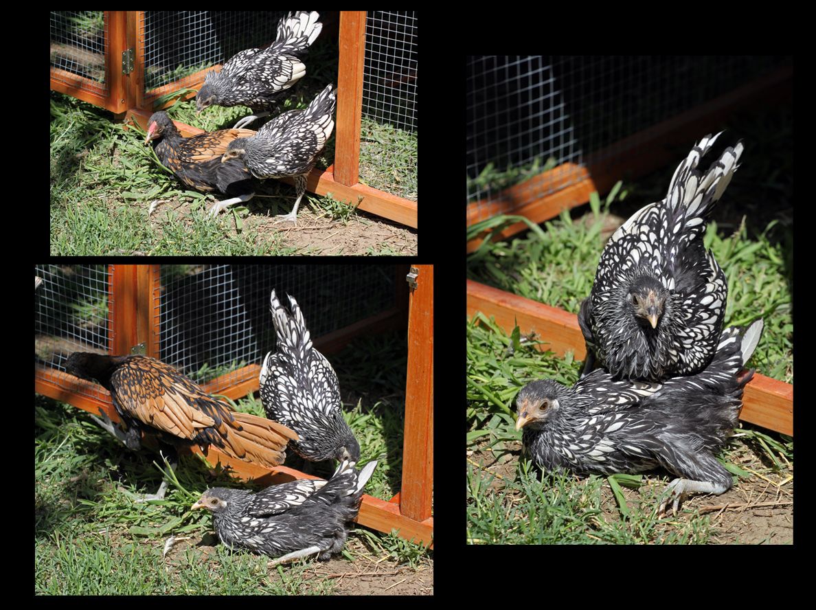 Pictures of the morning Sebright drama: the two Silver hens Ashe and Lux decide to bully the Golden roo Leon out of the best sun-bathing spot, lay down before he is gone, then cuddle in celebration.