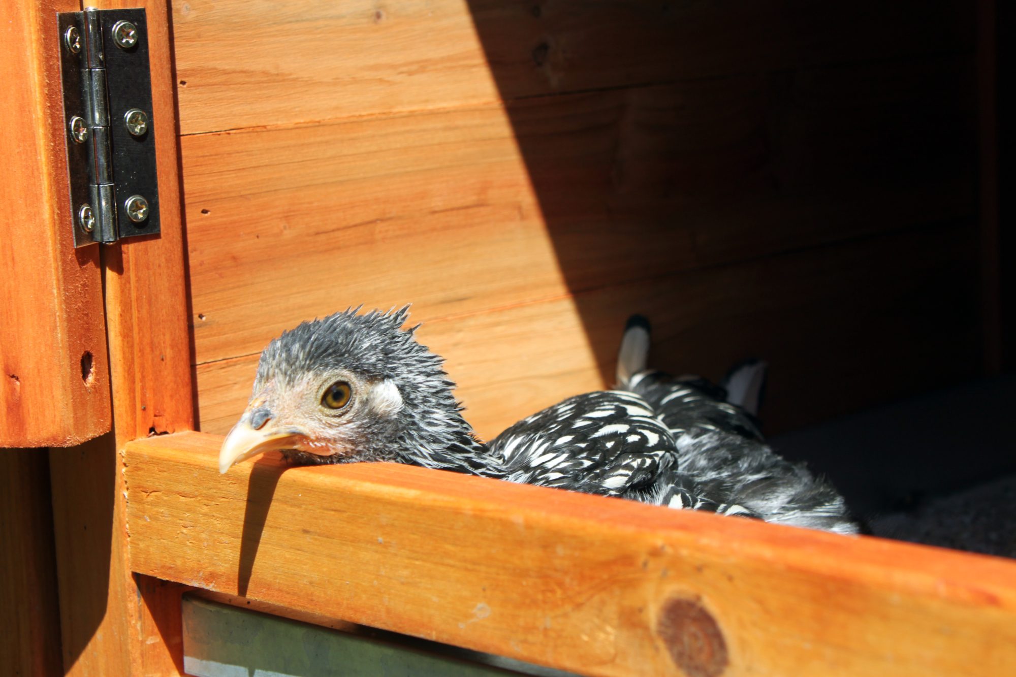 Bonus ridiculous: When she first woke up, it was a little windy and Lux was too lazy to leave the hen house, so when I opened up the door to encourage her to come out and play she just flopped onto the floor (newspaper with some sand) in the tiny patch of sun.