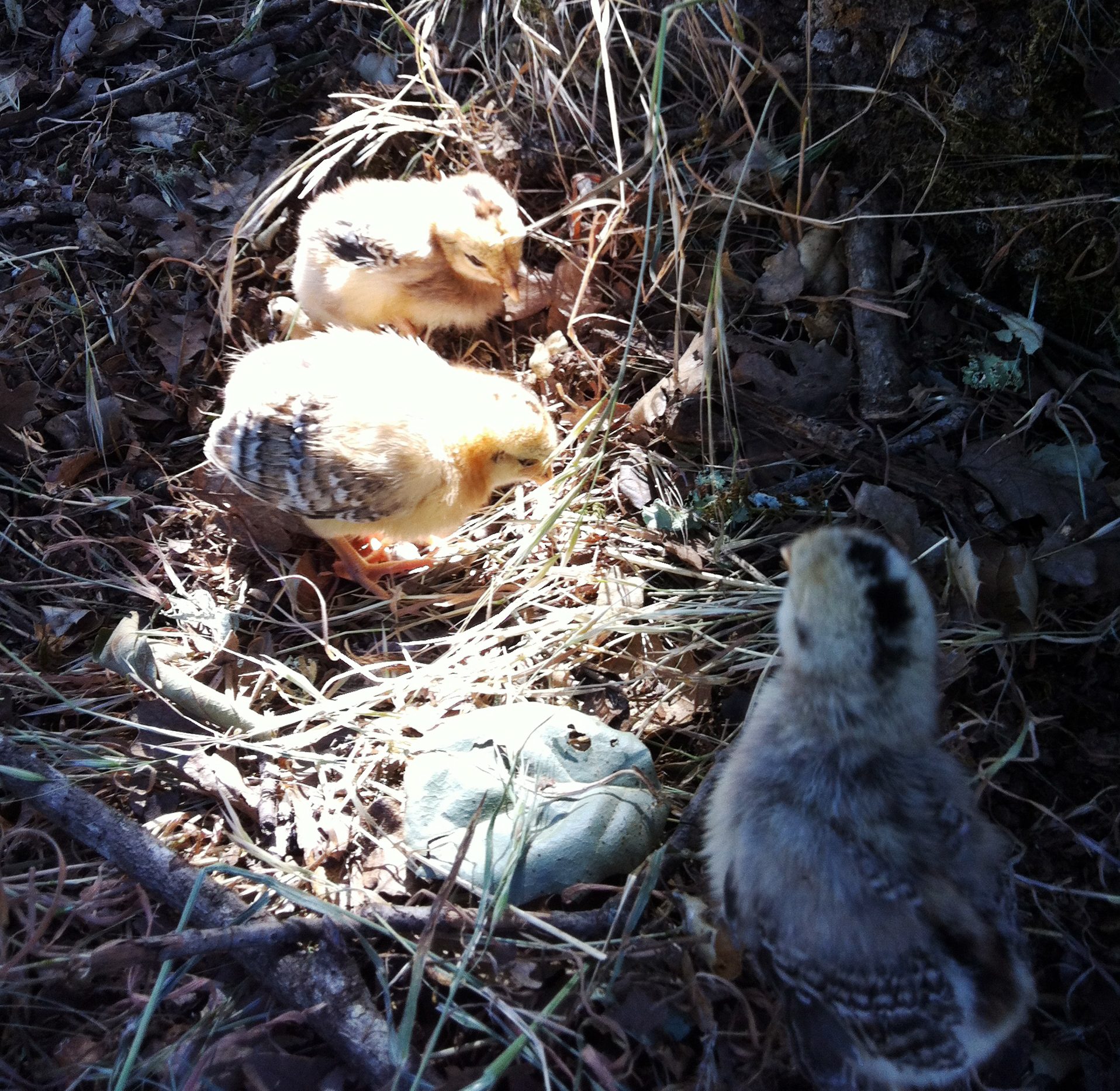 pecking around in the sunshine -- the one in the back has slightly smaller/slower-growing wing feathers, and is a bit smaller/quieter than the other two, but they're all quite active