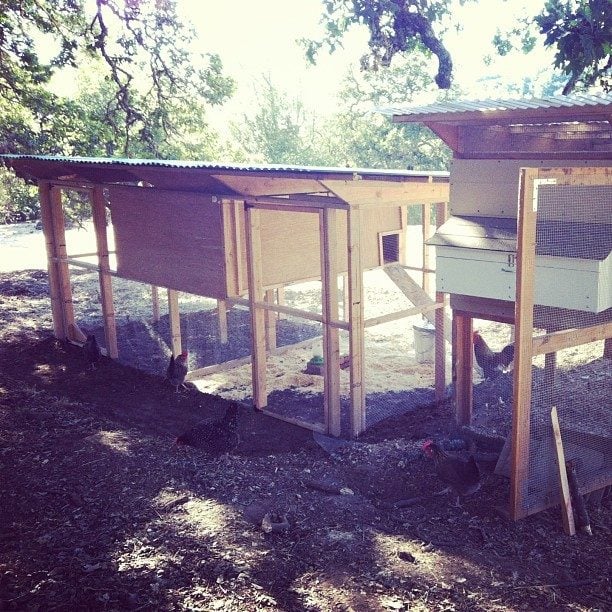 the original coop is on the right -- new structure has two 8x8' pens, back to back -- there's a divider through that one big henhouse, & a mesh divider on the bottom half. this was a simpler design, but in retrospect i may regret it, as the lefthand pen will probably be much wetter in the winter -- perhaps i can use it primarily for broodies or breeding, and so won't use it much in winter? or i can always put up a tarp/canvas covering for the side exposed to the SW, where most of our rain drives from. it still needs some perches and eventually some laying boxes, but for now, they are great spaces!