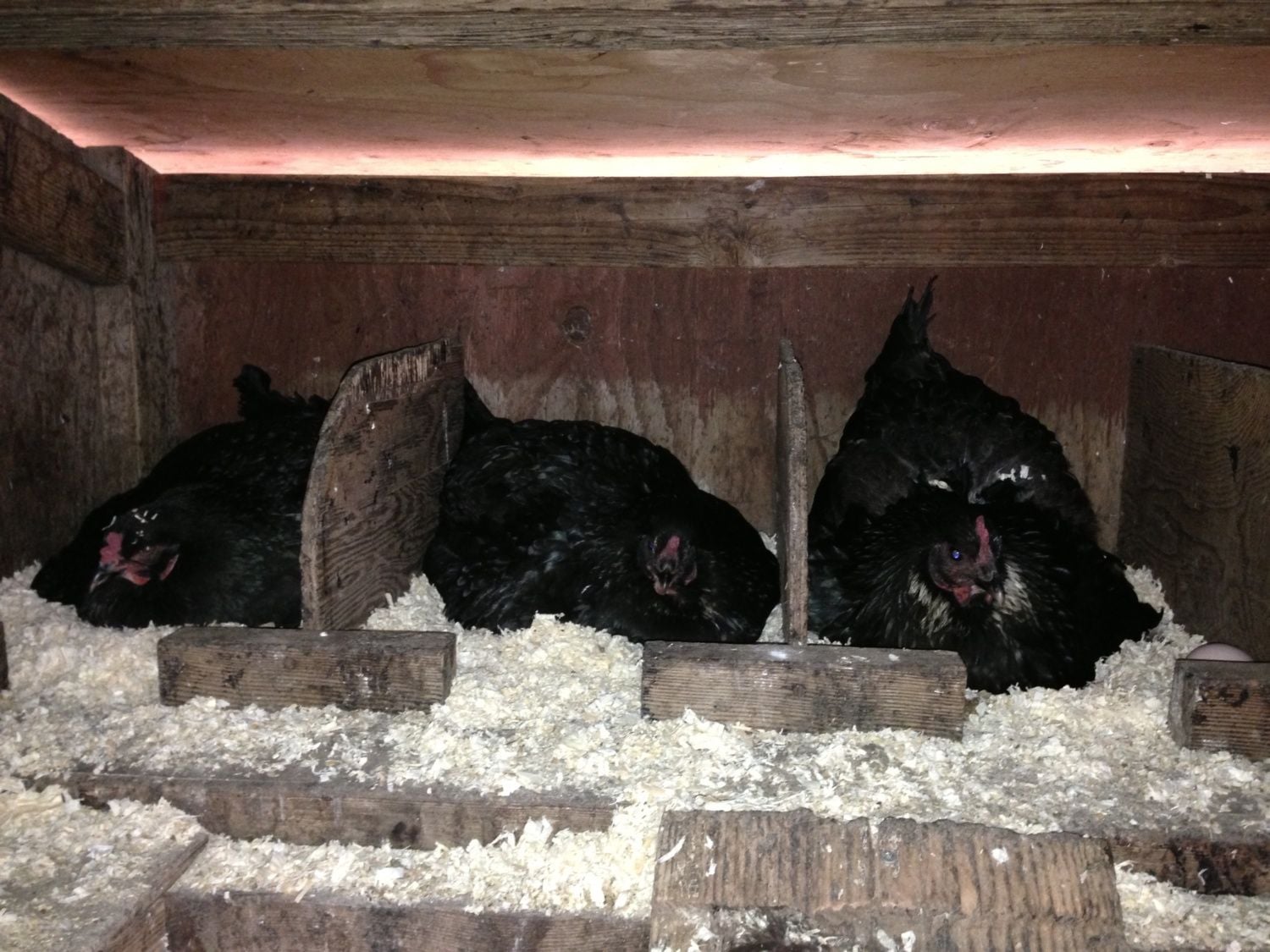 Went up to the coop and the 3 sisters are set like glue to their eggs. A little thunder and lightening wont break them! The thing that throws me is the swap the nest they sit on. They're hard to tell apart but I swear they are on different nests.