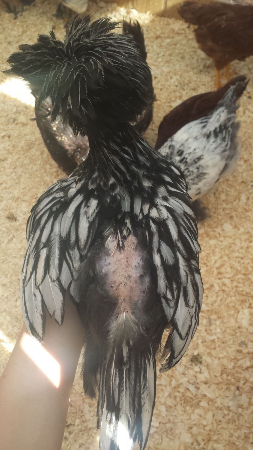 Do you have just one SL Polish? It may be a Polish thing. Some breeds feather slowly and it does not take too much feather pulling to bare their skin. Upping the protein often stops feather picking. Calf Mana or mixing in some Turkey grower may help. You could also pick up some Ultrakibble for Chicks from TSC. You might want to get some Blu Kote on the bare skin.
