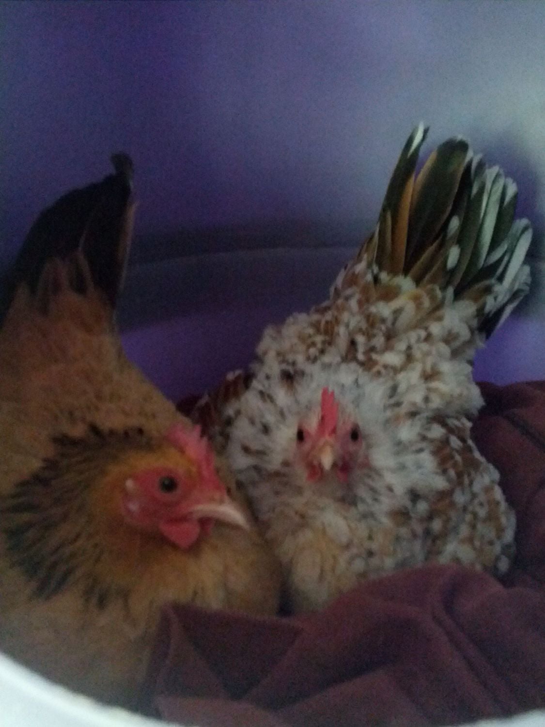 I found the best backdrop for taking pictures of chicks.. a silkie! seremas, a little and a big The little one is quail sized Little bantam frizzled cochin and breese. This bresse does not get silkies, he cant find UNDER all her fur. NO EGGS FOR YOU!! Broody seramas in a cat box.