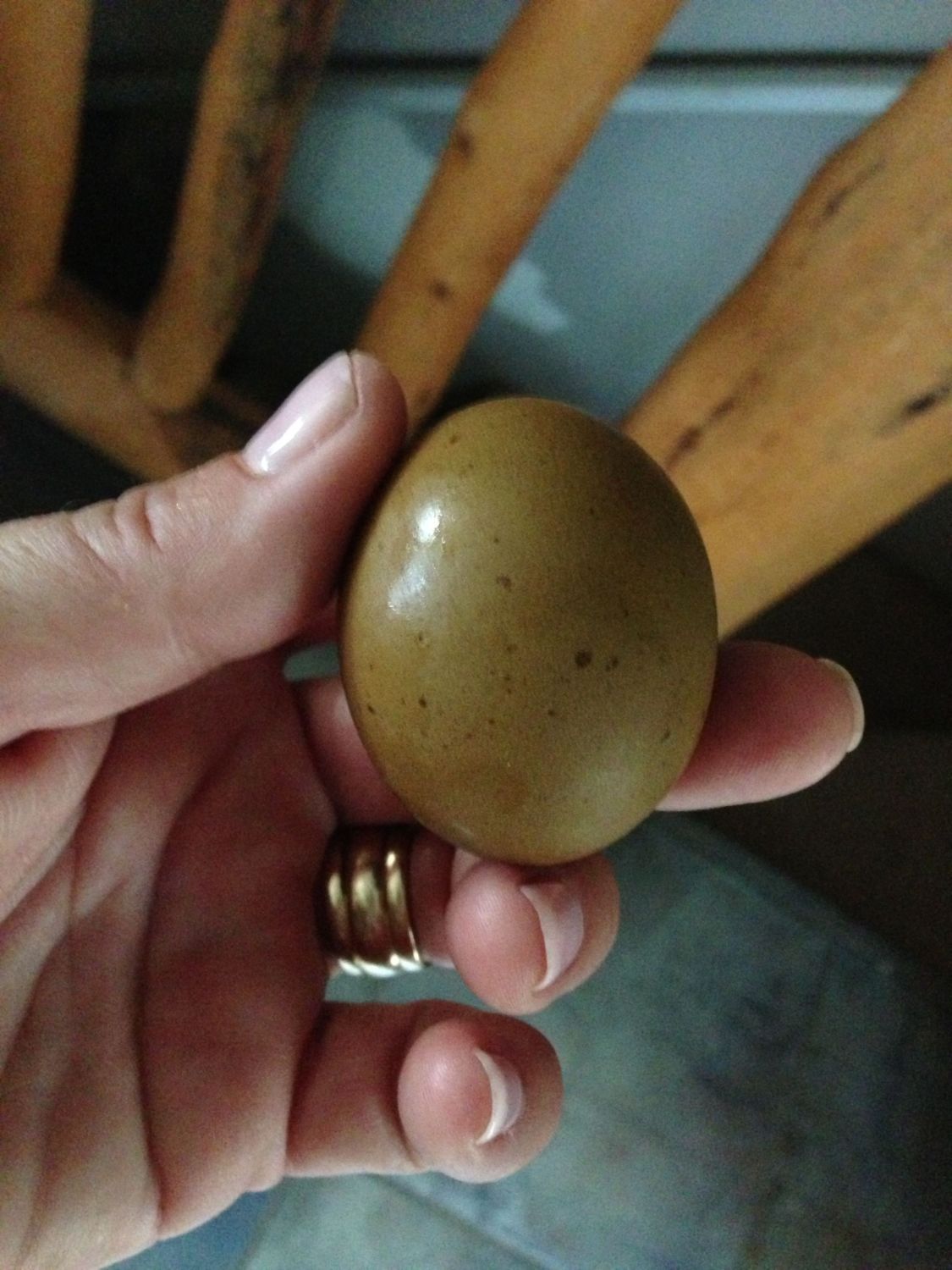 My very first egg from my very first Olive Egger! I was just looking at her this morning and didn't think she was red enough yet. I asked her when she was going to lay her first egg....she was probably wondering why I wasn't congratulating her! She's a beautiful Blue Marans/Silver Ameraucana. I'm SO happy with her color! My Blue Marans are Wade Jean I got from Papa Brooder. I had so much trouble getting here. I bought six and they had black mold and lost half of them within the first few weeks but ended up with 2 blue pullets and one beautiful blue cockerel. When they were finally able to join the flock the cockerel went missing one day so I ended up with just the two blue pullets. They lay a nicely dark egg for blue's. I am pleasantly surprised at the darkness of this egg coming from blue Marans.