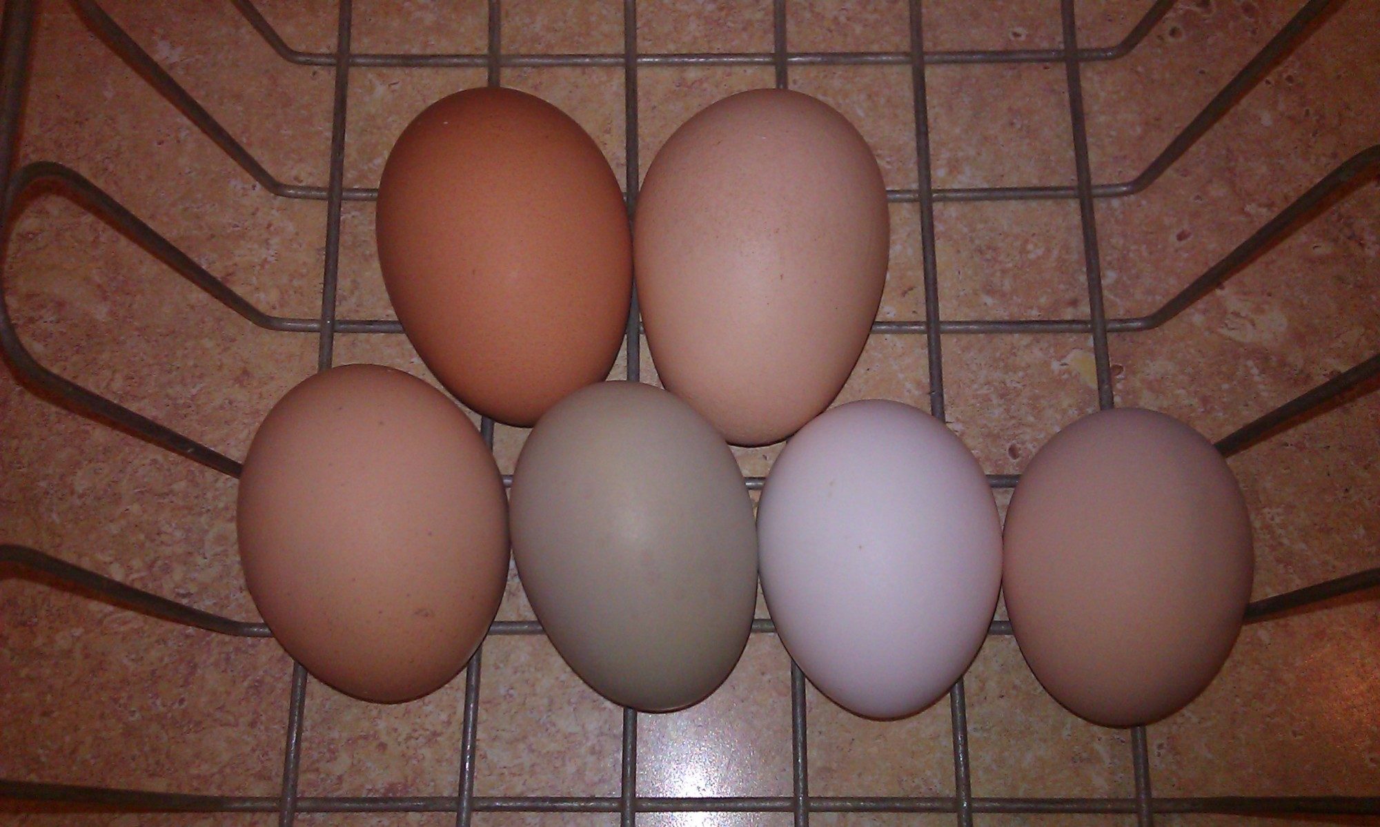 bottom row all pullet eggs. That is Willa, my OE's first with Harriet (Del) Blanche (CA Grey) and Godiva (Choc Rock) Top row My only two layers out of 4 from the big girls dept today were Vivian (Red Star) and That big weird looking one is from Dottie the Del. Probably two yolks in there. Della laid a rubber egg on the poo tray in the night so at least things are moving a long in there.